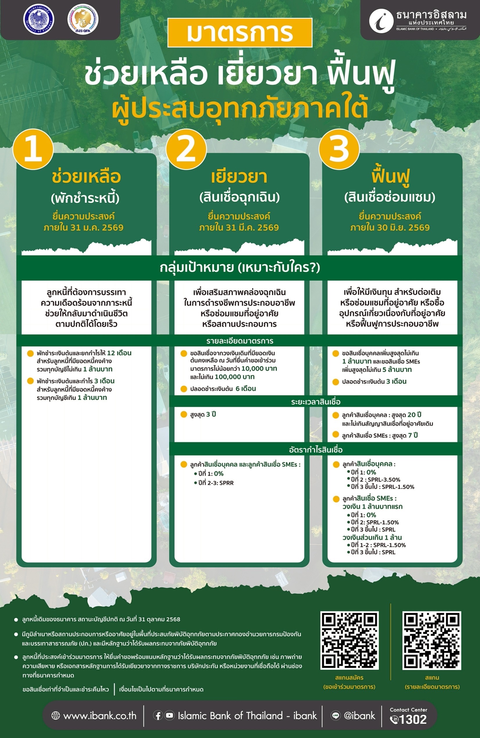 ธนาคารอิสลามแห่งประเทศไทย (ไอแบงก์) ขานรับนโยบายกระทรวงการคลังที่มอบหมายให้สถาบันการเงินของรัฐทุกแห่งเร่งบรรเทาความเดือดร้อนให้ลูกหนี้ที่ได้รับผลกระทบจากอุทกภัยครั้งใหญ่ในพื้นที่ภาคใต้ ครอบคลุม 10 จังหวัด โดยได้จัดทำ "มาตรการ ช่วยเหลือ เยียวยา และฟื้นฟู ผู้ประสบอุทกภัยภาคใต้" เพื่อลดภาระทางการเงิน พร้อมทั้งสนับสนุนเงินทุนเพิ่มสภาพคล่องฉุกเฉินและฟื้นฟูธุรกิจให้กลับมาฟื้นตัวอย่างรวดเร็ว