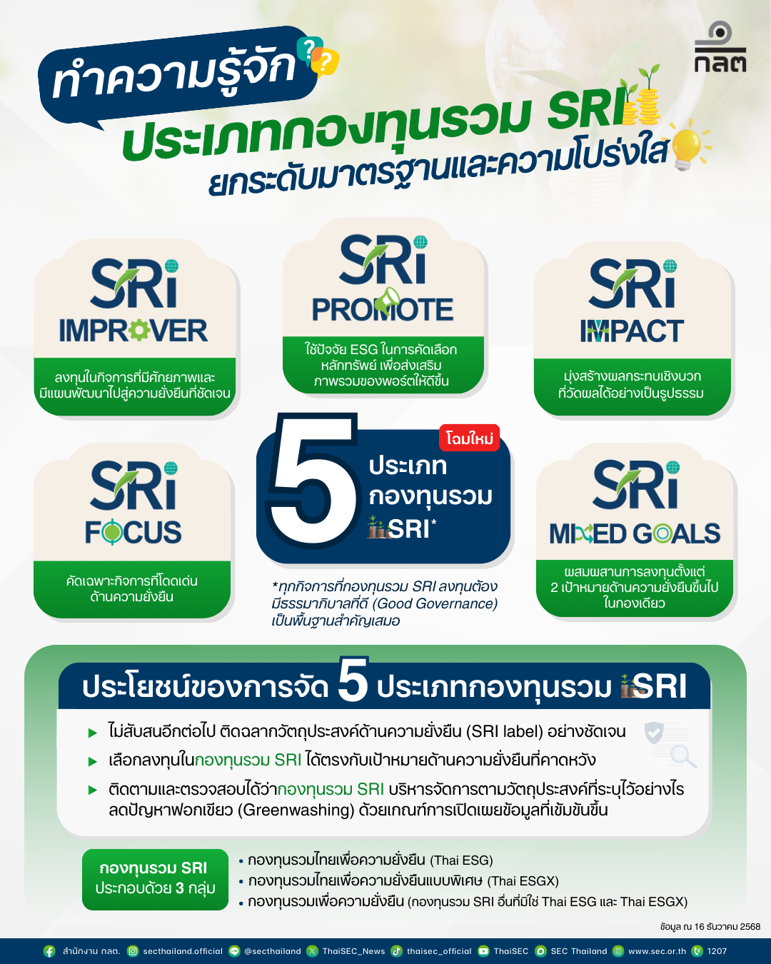สำนักงานคณะกรรมการกำกับหลักทรัพย์และตลาดหลักทรัพย์ (ก.ล.ต.) ออกประกาศปรับปรุงหลักเกณฑ์ที่เกี่ยวกับ กองทุนรวม SRI* (Sustainable and Responsible Investing Fund) เพื่อยกระดับมาตรฐานการกำกับดูแล เพิ่มความโปร่งใส ลดความเสี่ยงจากการฟอกเขียว (greenwashing) และสร้างความเชื่อมั่นให้แก่ผู้ลงทุน โดยคาดหวังการเป็นหนึ่งในกลไกสำคัญที่ช่วยขับเคลื่อนการลงทุนอย่างยั่งยืน และสนับสนุนการเติบโตของตลาดทุนไทยในระยะยาว ซึ่งมีผลใช้บังคับตั้งแต่วันที่ 16 ธันวาคม พ.ศ. 2568 เป็นต้นไป