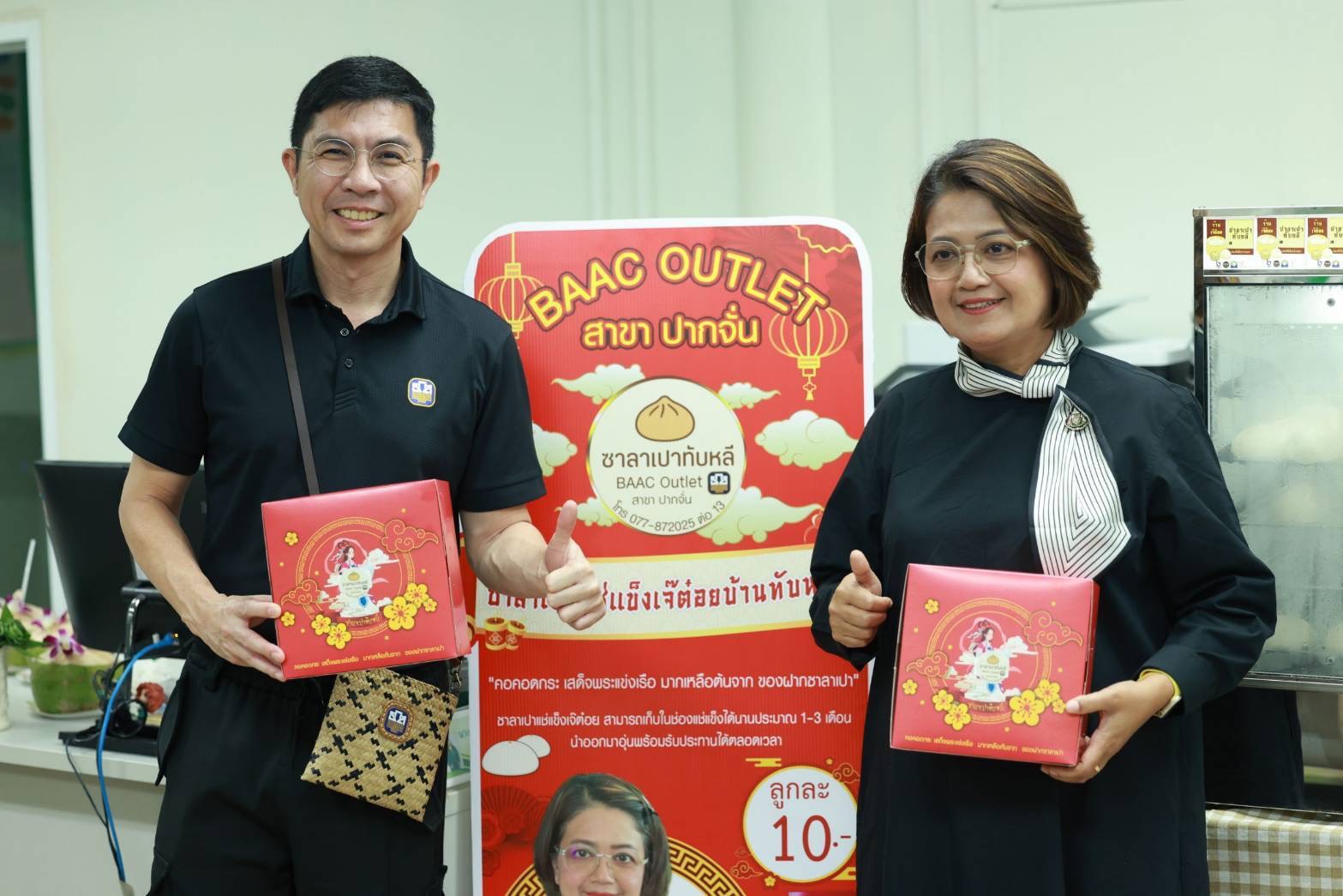 ในโอกาสนี้ ได้เยี่ยมชม BAAC Branch Outlet พร้อมให้ข้อเสนอแนะเกี่ยวกับการจัดวางผลิตภัณฑ์ (Product Display) และการพัฒนาคุณภาพสินค้าตามแนวทางการเป็นแกนกลางการเกษตร (Essence of Agriculture) เพื่อให้พนักงานสามารถนำไปปรับใช้ในการถ่ายทอดองค์ความรู้ให้กับเกษตรกรลูกค้า อันนำไปสู่การเป็นผลิตภัณฑ์เกษตรมูลค่าสูง อาทิ คุกกี้ผักเหลียง แสนอร่อย ครบถ้วนด้วยสารอาหารที่เป็นประโยชน์ต่อสุขภาพจากเกษตรกรสาขาละอุ่น ผลิตภัณฑ์ผงโกโก้ ชาเปลือกโกโก้ และโกโก้นิบส์ ผลิตจากโกโก้แท้คุณภาพ 100% จากกลุ่มวิสาหกิจโกโก้ระนอง กระเป๋าจักสานรักษ์โลกจากบ้านไร่ไออรุณ และซาลาเปาแช่แข็งเจ๊ต๋อยบ้านทับหลี ของดีจังหวัดระนอง ที่สามารถเก็บรักษาไว้ได้นานถึง 3 เดือน นำมาอุ่นรับประทานได้สะดวกและง่าย สำหรับผู้ที่สนใจสามารถเลือกชมและเข้าถึงสินค้าแกลมเกษตรที่เต็มไปด้วยคุณภาพจากเกษตรกรทั่วประเทศได้ง่าย สะดวก รวดเร็ว เพียงไม่กี่คลิก พร้อมบริการจัดส่งสินค้าถึงหน้าบ้านผู้บริโภคโดยตรง ผ่าน BAAC Matching เว็บไซต์ https://baacmatching.baac.or.th หรือสามารถเยี่ยมชมและเลือกซื้อผลิตภัณฑ์คุณภาพจากเกษตรกรลูกค้า ธ.ก.ส. ที่ร้านกาชาดกระทรวงการคลัง ในงานกาชาด ประจำปี 2568 เช่น ข้าวพร้อมทานตราอุ่นอิ่ม ที่สามารรับประทานได้ทันที สะดวก สะอาด ปลอดภัย พกพาง่ายโดยไม่ต้องอุ่นเก็บได้นานถึง 18 เดือน เครื่องดื่ม ขนม และของว่างทานเล่นแสนอร่อย และสินค้าประเภท Crafts ที่ผลิตด้วยฝีมืออันประณีตจากชุมชน เป็นต้น โดยสินค้าทุกชิ้นที่เลือกซื้อยังเป็นส่วนสำคัญในการเสริมสร้างศักยภาพภาคเกษตรไทยให้เติบโตอย่างแข็งแกร่งและยั่งยืนอีกด้วย สอบถามเพิ่มเติม Call Center 02 555 0555
