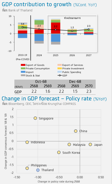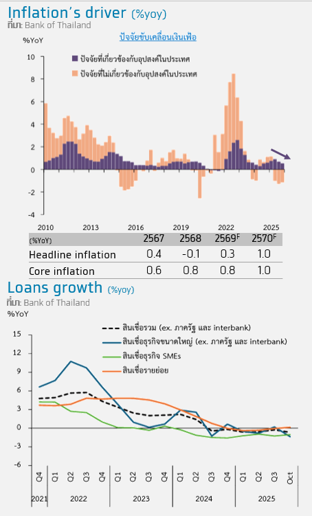 • เศรษฐกิจไทยมีแนวโน้มการเติบโตที่ชะลอตัวอย่างชัดเจน และมีความเสี่ยงที่มากขึ้น โดย กนง. คาดว่าเศรษฐกิจจะขยายตัวชะลอลงจากการบริโภคที่แผ่วลงตามแนวโน้มรายได้ที่ขยายตัวต่ำ โดยเฉพาะในภาคการผลิต และผลกระทบของ US tariff ที่จะทยอยเพิ่มขึ้น อีกทั้งผลของสถานการณ์อุทกภัยในพื้นที่ภาคใต้ที่ส่งผลกระทบต่อกิจกรรมทางเศรษฐกิจ โดยเฉพาะในภาคบริการ ซึ่งผลกระทบนี้คาดว่าจะต่อเนื่องไปจนถึงไตรมาสแรกของปี 2569 โดยรวมทำให้เกิดความเสี่ยงเพิ่มเติมต่อ SMEs และครัวเรือนในกลุ่มเปราะบาง ขณะที่แนวโน้มการท่องเที่ยวคาดว่าจะทยอยฟื้นตัวอย่างช้าๆ