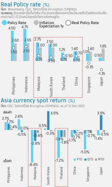 • โดยอัตราดอกเบี้ยที่แท้จริงที่ กนง. ชี้ว่าอยู่ในระดับผ่อนคลาย Krungthai COMPASS คาดว่าในปีหน้าอาจสามารถผ่อนคลายเพิ่มเติมอย่างน้อย 0.25% หากโมเมนตัมเศรษฐกิจอ่อนแอกว่าที่ประเมิน จากทั้งข้อตกลงทางการค้ากับสหรัฐที่ยังไม่ได้ข้อสรุป และการเบิกจ่ายที่อาจล่าช้า ซึ่งจะกระทบรายได้เพิ่มเติม นอกจากนี้ GDP ปี 2569 และ 2570 ที่ กนง. คาดว่าจะขยายตัวที่ 1.5% และ 2.3% ตามลำดับ ทำให้เฉลี่ย 5 ปี กนง. มองว่าเศรษฐกิจไทยขยายตัวได้เพียง 2.1% ต่ำกว่าช่วง 5 ปีก่อนโควิดที่ขยายตัวได้เฉลี่ยที่ 3.4% เอื้อให้นโยบายการเงินสนับสนุนได้เพิ่มเติม อีกทั้งเมื่อเปรียบเทียบกับภูมิภาคอัตราดอกเบี้ยที่แท้จริงของไทยยังอยู่ในระดับใกล้เคียงกับมาเลเซีย เกาหลีใต้ และจีน