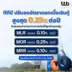 ทีทีบี ปรับลดอัตราดอกเบี้ยเงินกู้สูงสุด 0.25% ต่อปี ช่วยบรรเทาภาระทางการเงินให้ลูกค้าทุกกลุ่ม