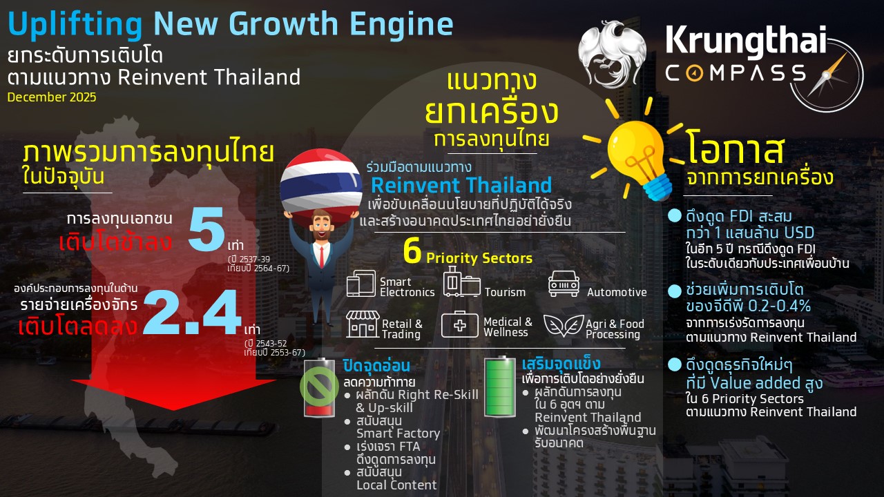 ศูนย์วิจัย Krungthai COMPASS มองการเร่งรัดการลงทุนโดยมุ่งเป้าใน 6 อุตสาหกรรมตามแนวทาง Reinvent Thailand ซึ่งเป็นกลุ่มที่มีศักยภาพและสร้าง Multiplier ได้สูง จะสามารถเพิ่มอัตราการเติบโตของจีดีพีระยะข้างหน้าได้อีกประมาณ 0.2-0.4% ต่อปี ผ่านการส่งเสริมการนำเทคโนโลยีและนวัตกรรมมาใช้ เพิ่มขีดความสามารถในการแข่งขัน ยกระดับผลิตภาพ และทักษะแรงงาน โดยใช้ประโยชน์จากมาตรการสนับสนุนจากภาครัฐที่ออกมา เช่น สินเชื่อดอกเบี้ยต่ำ (Soft loan) และการค้ำประกันสินเชื่อที่จะช่วยให้เข้าถึงแหล่งเงินทุนได้ง่ายขึ้น