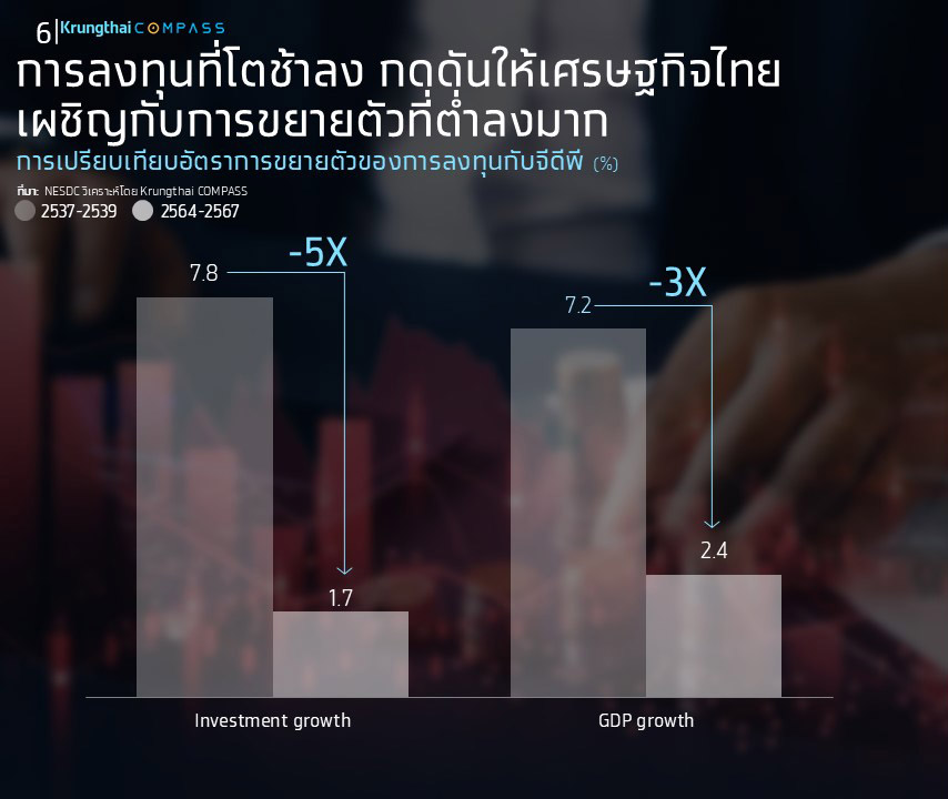 ดร.พชรพจน์ นันทรามาศ ผู้ช่วยกรรมการผู้จัดการใหญ่ และ Chief Economist ธนาคารกรุงไทย เปิดเผยว่า ปัจจัยหลักที่ส่งผลต่อปรากฏการณ์เศรษฐกิจโตต่ำของไทยมาจากการลงทุนที่แผ่วลงกว่าเดิม 5 เท่า และฉุดรั้งให้การเติบโตทางเศรษฐกิจช้าลงไปถึง 3 เท่าเมื่อเทียบกับช่วงกว่า 20 ปีก่อน ด้วยผลพวงจากรอยแผลเป็นหลังวิกฤตหลายระลอก และความท้าทายในการรับมือกับบริบทโลกใหม่ที่แปรเปลี่ยนไปอย่างรวดเร็ว