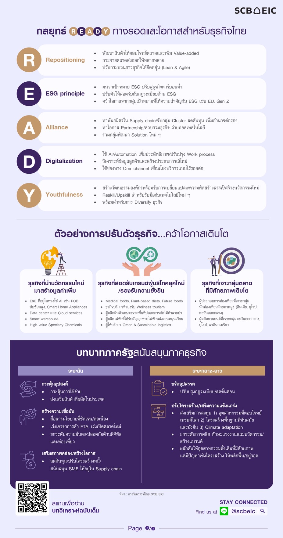 SCB EIC เสนอกลยุทธ์การปรับตัวของธุรกิจท่ามกลางความเสี่ยงรอบด้านและคว้าโอกาสใหม่ที่รออยู่ข้างหน้า ดังนี้ R – Repositioning : การเพิ่มขีดความสามารถในการแข่งขัน โดยพัฒนาสินค้า/บริการให้มีมูลค่าเพิ่ม เช่น มีนวัตกรรมและมีคุณภาพสูงเพื่อสร้างความแตกต่างจากคู่แข่ง ตลอดจนตอบโจทย์ความต้องการของผู้บริโภคที่เปลี่ยนแปลงเร็ว ขณะเดียวกัน ต้องมีการกระจายตลาดและมองหาตลาดใหม่ ๆ ที่มีศักยภาพเพื่อช่วยลดความเสี่ยงจากการพึ่งพาตลาดใดตลาดหนึ่งมากเกินไป และลดความเสี่ยงจากปัญหาห่วงโซ่อุปทานสะดุด นอกจากนี้ ผู้ประกอบการควรประเมินศักยภาพการแข่งขันของธุรกิจให้สอดคล้องกับ Mega trends และ Supply chain ที่เปลี่ยนแปลงไป ตลอดจนปรับกระบวนการทางธุรกิจ ได้แก่ รูปแบบการทำงานแบบ Agile management ให้ยืดหยุ่นต่อการเปลี่ยนแปลง หรือการนำแนวคิด Lean operations ที่เน้นเพิ่มประสิทธิภาพ ลดความสูญเสีย มาปรับใช้ในการดำเนินธุรกิจ