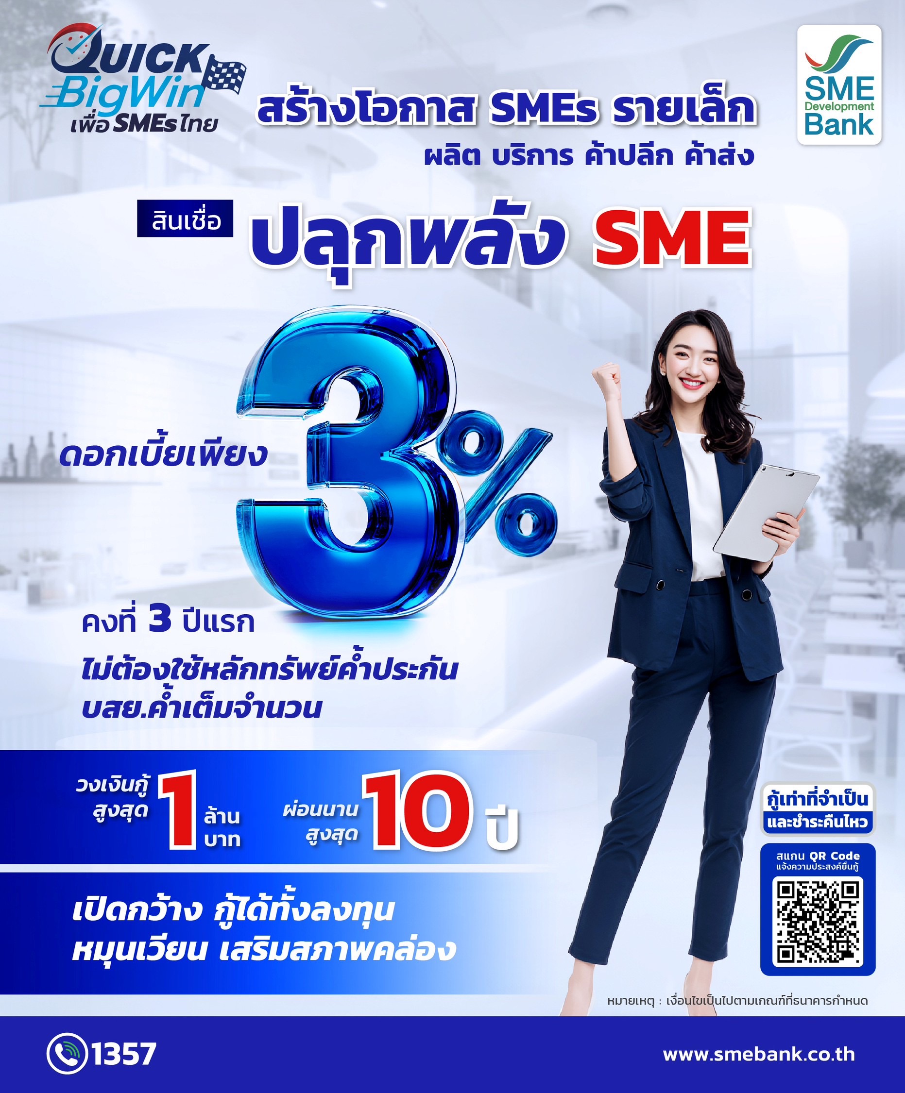 SME D Bank เปิดตัว 2 โครงการสินเชื่อใหม่ ขับเคลื่อนนโยบาย "Quick Big Win เพื่อ SMEs ไทย" ของรัฐบาล ได้แก่ "สินเชื่อปลุกพลัง SME" และ "สินเชื่อ Beyond ติดปีก SME" วงเงินรวม 20,000 ล้านบาท หนุนเอสเอ็มอีเข้าถึงแหล่งทุนดอกเบี้ยพิเศษเพียง 3% ต่อปี คงที่ตลอด 3 ปีแรก ผ่อนนาน 10 ปี วงเงินกู้สูงสุดถึง 30 ล้านบาท ช่วยเสริมสภาพคล่อง ลดต้นทุนการเงิน สามารถสนับสนุนเดินหน้าธุรกิจได้เต็มกำลัง สร้างการเติบโตอย่างยั่งยืน