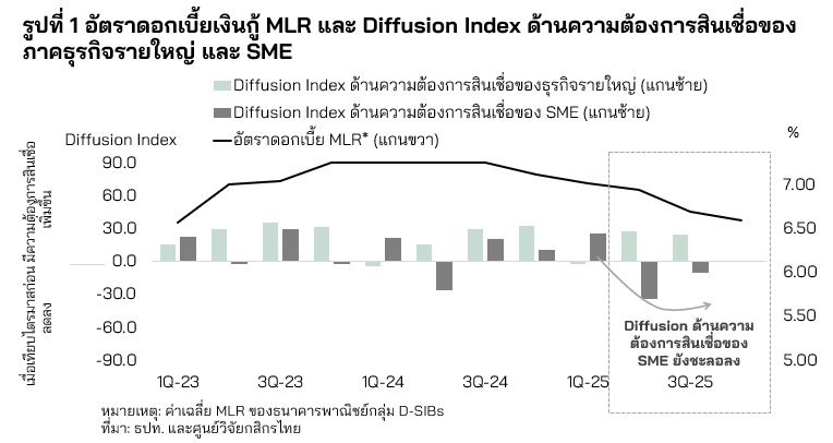 • พฤติกรรมผู้กู้ยังอยู่ในภาวะระมัดระวัง แม้ต้นทุนทางการเงินจะทยอยลดลง การปรับลดอัตราดอกเบี้ยแม้จะช่วยลดภาระต้นทุนการกู้ยืม แต่ในเชิงพฤติกรรมผู้กู้จำนวนมากยังคงชะลอการตัดสินใจก่อหนี้เพิ่มเติมซึ่งจะกลายเป็นภาระผูกพันระยะยาว โดยเฉพาะในกลุ่ม SME ที่การฟื้นตัวของรายได้มีความไม่แน่นอนกว่ากลุ่มธุรกิจรายใหญ่ สะท้อนจากดัชนี Diffusion Index ด้านความต้องการสินเชื่อของ SME ที่มีทิศทางชะลอลงตั้งแต่ช่วงกลางปี 2568 (รูปที่ 1) แม้อัตราดอกเบี้ยเงินกู้จะยังคงทยอยลดลง