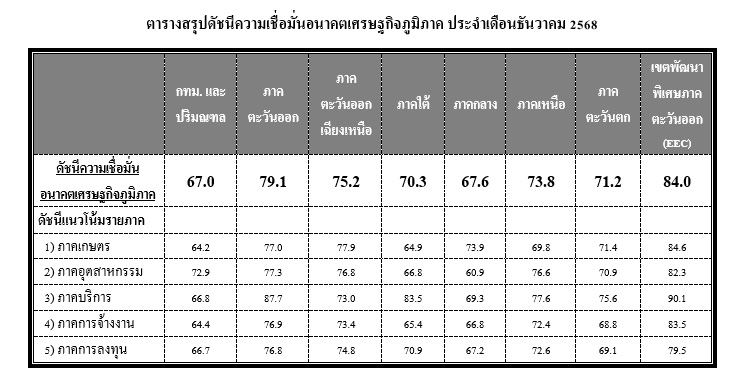 ดัชนีความเชื่อมั่นอนาคตเศรษฐกิจภาคตะวันออกอยู่ที่ระดับ 79.1 สะท้อนถึงความเชื่อมั่นอนาคตเศรษฐกิจที่ขยายตัวได้ โดยเฉพาะในภาคบริการและภาคอุตสาหกรรม จากการประชาสัมพันธ์การท่องเที่ยวและมาตรการส่งเสริมและพัฒนาแหล่งท่องเที่ยวจากภาครัฐและเอกชน รวมถึงอุปสงค์สินค้าอุตสาหกรรมที่มีต่อเนื่อง และคาดว่า รัฐบาลจะมีมาตรการกระตุ้นเศรษฐกิจอย่างต่อเนื่อง สอดคล้องกับดัชนีความเชื่อมั่นอนาคตเศรษฐกิจในเขตพัฒนาพิเศษภาคตะวันออก (EEC) ที่อยู่ที่ระดับ 84.0 ขณะเดียวกันดัชนีความเชื่อมั่นอนาคตเศรษฐกิจภาคตะวันออกเฉียงเหนืออยู่ที่ระดับ 75.2 โดยมีแรงสนับสนุนหลักจากภาคเกษตรและภาคอุตสาหกรรม เนื่องจากจะเข้าสู่ช่วงฤดูกาลเพาะปลูก สภาพอากาศคาดว่าจะเอื้ออำนวย ขณะที่อุปสงค์สินค้าเกษตรและอุตสาหกรรมมีแนวโน้มเพิ่มขึ้น ตามทิศทางการฟื้นตัวของเศรษฐกิจไทย ดัชนีความเชื่อมั่นอนาคตเศรษฐกิจภาคเหนืออยู่ที่ระดับ 73.8 โดยมีปัจจัยบวกจากภาคบริการและภาคอุตสาหกรรม จากมาตรการส่งเสริมการท่องเที่ยวและมาตรการกระตุ้นเศรษฐกิจของภาครัฐที่คาดว่าจะมีต่อเนื่อง และคาดว่า จะมีผลผลิตเกษตรซึ่งเป็นวัตถุดิบในการผลิตสินค้าอุตสาหกรรมแปรรูปเพิ่มมากขึ้น รวมถึงความต้องการสินค้าอุตสาหกรรมที่มีต่อเนื่อง สำหรับดัชนีความเชื่อมั่นอนาคตเศรษฐกิจภาคตะวันตกอยู่ที่ระดับ 71.2 โดยมีแรงสนับสนุนจากภาคบริการและภาคเกษตรเป็นสำคัญ จากนโยบายกระตุ้นการบริโภคและสนับสนุนเศรษฐกิจของรัฐบาล รวมถึงการจัดกิจกรรมส่งเสริมการท่องเที่ยวที่มีต่อเนื่องจะช่วยสนับสนุนการฟื้นตัวของเศรษฐกิจไทย ขณะเดียวกันความต้องการสินค้าเกษตรคาดว่าจะเพิ่มมากขึ้นจากทั้งในและต่างประเทศ ดัชนีความเชื่อมั่นอนาคตเศรษฐกิจภาคใต้อยู่ที่ระดับ 70.3 โดยมีแรงขับเคลื่อนหลักจากภาคบริการและการลงทุน ตามแนวโน้มการฟื้นตัวของเศรษฐกิจไทย และคาดว่า รัฐบาลชุดใหม่จะมีนโยบายกระตุ้นเศรษฐกิจเพิ่มเติม อย่างไรก็ตาม ต้องติดตามความชัดเจนทางการเมืองในประเทศ ความแปรปรวนของสภาพอากาศที่อาจส่งผลกระทบต่อการเดินทางท่องเที่ยวและภาคเกษตร รวมถึงความผันผวนของเศรษฐกิจโลก และการแข่งขันในตลาดโลกที่สูงขึ้น ดัชนีความเชื่อมั่นอนาคตเศรษฐกิจภาคกลางอยู่ที่ระดับ 67.6 โดยมีแรงสนับสนุนจากภาคเกษตรและภาคบริการ จากมาตรการสนับสนุนของรัฐบาล การขยายตัวของตลาดสินค้าเกษตร ประกอบกับการจัดกิจกรรมส่งเสริมการท่องเที่ยวและงานเทศกาลในหลายพื้นที่ ทั้งนี้ สภาพอากาศที่แปรปรวนและความไม่แน่นอนทางการเมืองในประเทศอาจส่งผลให้