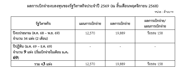 นางสาวปิยวรรณ ล่ามกิจจา ที่ปรึกษาด้านพัฒนารัฐวิสาหกิจ กล่าวเพิ่มเติมว่า ณ เดือนพฤศจิกายน 2568 รัฐวิสาหกิจปีงบประมาณได้เริ่มการเบิกจ่ายงบลงทุนเป็นเดือนที่สองของปีบัญชี 2569 โดยมีผลการเบิกจ่ายจำนวน 19,889 ล้านบาท คิดเป็นร้อยละ 158 ของแผนการเบิกจ่าย ทั้งนี้ รัฐวิสาหกิจปีงบประมาณที่เบิกจ่ายสูงกว่าร้อยละ 95 ของแผนการเบิกจ่ายและมีมูลค่าสูงสุด 3 อันดับ ได้แก่ รฟท. รฟม. และการประปาส่วนภูมิภาค