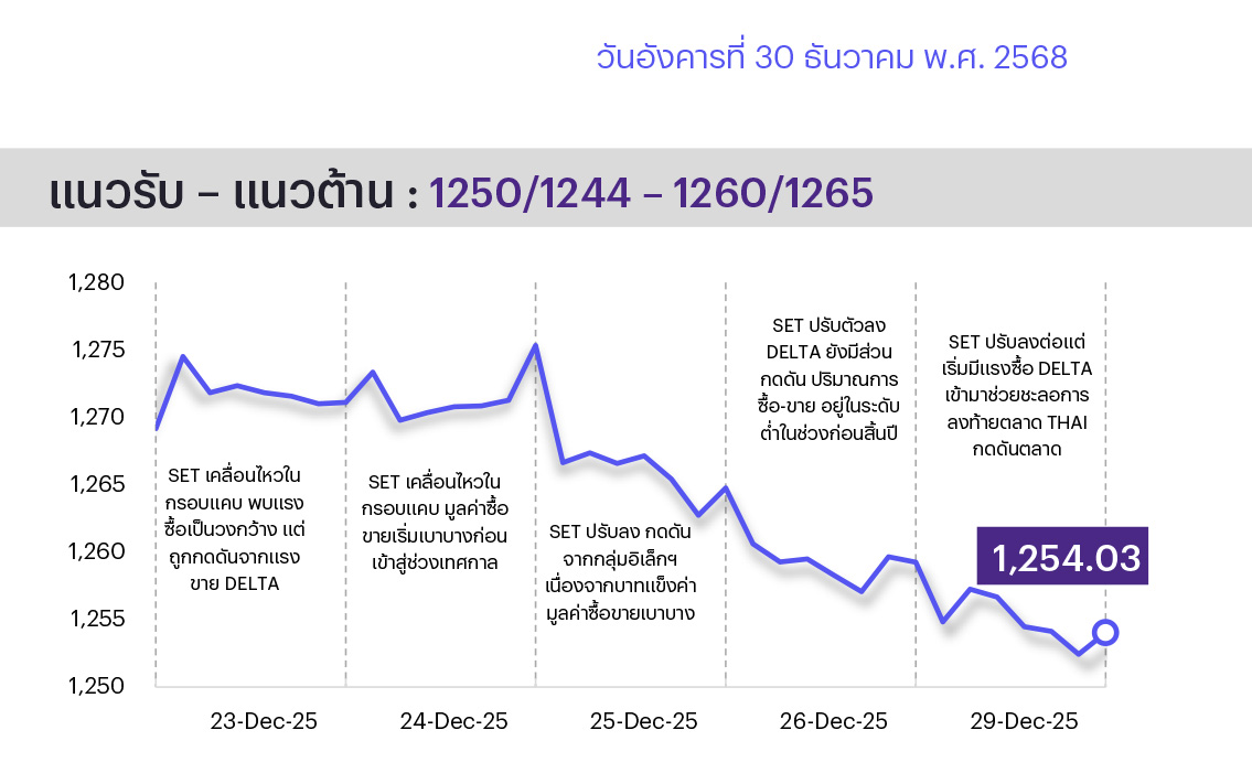 คาดตลาดแกว่งไซด์เวย์/รีบาวด์ นักลงทุนสถาบันเริ่มกลับมาซื้อสุทธิในขณะที่นักลงทุนต่างชาติขายสุทธิลดลง ค่าเงินบาทอ่อนค่าหลังทองคำปรับตัวลงแรง ลดความกังวลหุ้นส่งออกและอาจหนุน Delta ขณะที่แรงซื้อกองทุนลดหย่อนภาษีวันสุดท้ายยังเป็นความหวัง ด้านราคาน้ำมันที่ปรับตัวขึ้นมีโอกาสหนุนหุ้นพลังงานต้นน้ำ ทางเทคนิค ระยะสั้นหลุดแนวรับหลักที่ 1257 ทำให้มีช่วงลงทดสอบจุดต่ำสุดเดิมที่ 1250/1244 ที่บริเวณนี้มีโอกาสทำให้หยุดไหลหรือดีดกลับได้ มีแนวต้านที่ 1260/1265