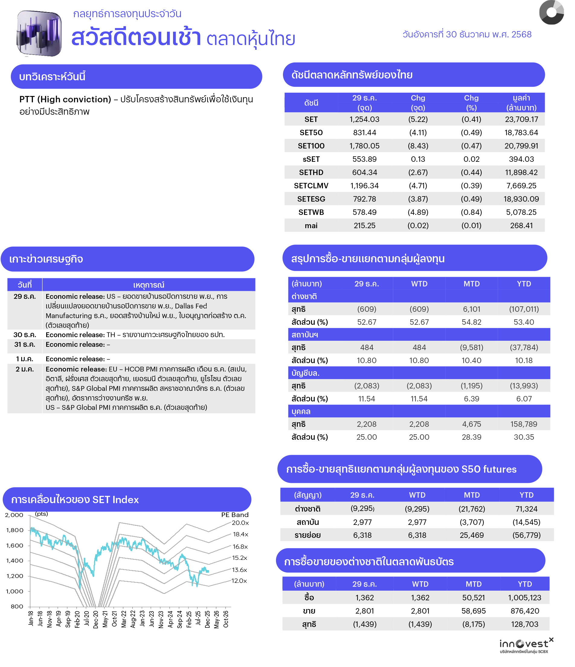 PTT : มีปัจจัยกระตุ้นจากราคาน้ำมันที่ปรับขึ้น บริษัทวางเป้าหมายเป็นผู้นําในธุรกิจ LNG ภูมิภาคผ่านการลงทุนเชิงรุกในโครงสร้างพื้นฐาน LNG และ ปลดล็อกมูลค่าจาก Asset Monetization ส่วน Valuation น่าสนใจ ซื้อขายที่ P/BV ปี 69 เพียง 0.7 เท่าและ P/E 10.8 เท่าต่ำกว่าค่าเฉลี่ย 10 ปี พร้อมปันผล 6% เป้าหมายระยะสั้น 32.50 บาท