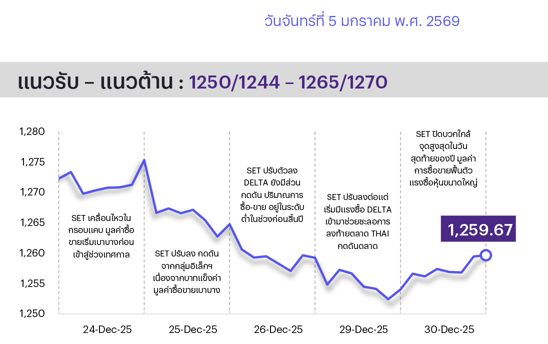 คาดตลาดแกว่งไซด์เวย์/ปรับขึ้น สหรัฐฯ จับกุม ปธน. เวเนซุเอลา แม้กดดันจิตวิทยาระยะสั้น แต่คาดว่าจะจบเร็วและไม่ยืดเยื้อและมีผลกระทบต่อตลาดจำกัด ขณะที่วันศุกร์หุ้นเอเชียส่วนใหญ่ปรับตัวขึ้นในวันทำการแรกของปี สถิติหุ้นไทยช่วง 5 ปีที่ผ่านมาชี้ว่า SET ให้ผลตอบแทนเป็นบวกในสัปดาห์แรกของปีที่เฉลี่ย 1.3% ทางเทคนิค ตลาดขึ้นหลังทดสอบจุดต่ำสุดเดิม 1250/1244 บริเวณนี้มีโอกาสดีดกลับ หากยังไม่หลุดแนวรับอย่างเด็ดขาด มีแนวต้านที่ 1265/1270