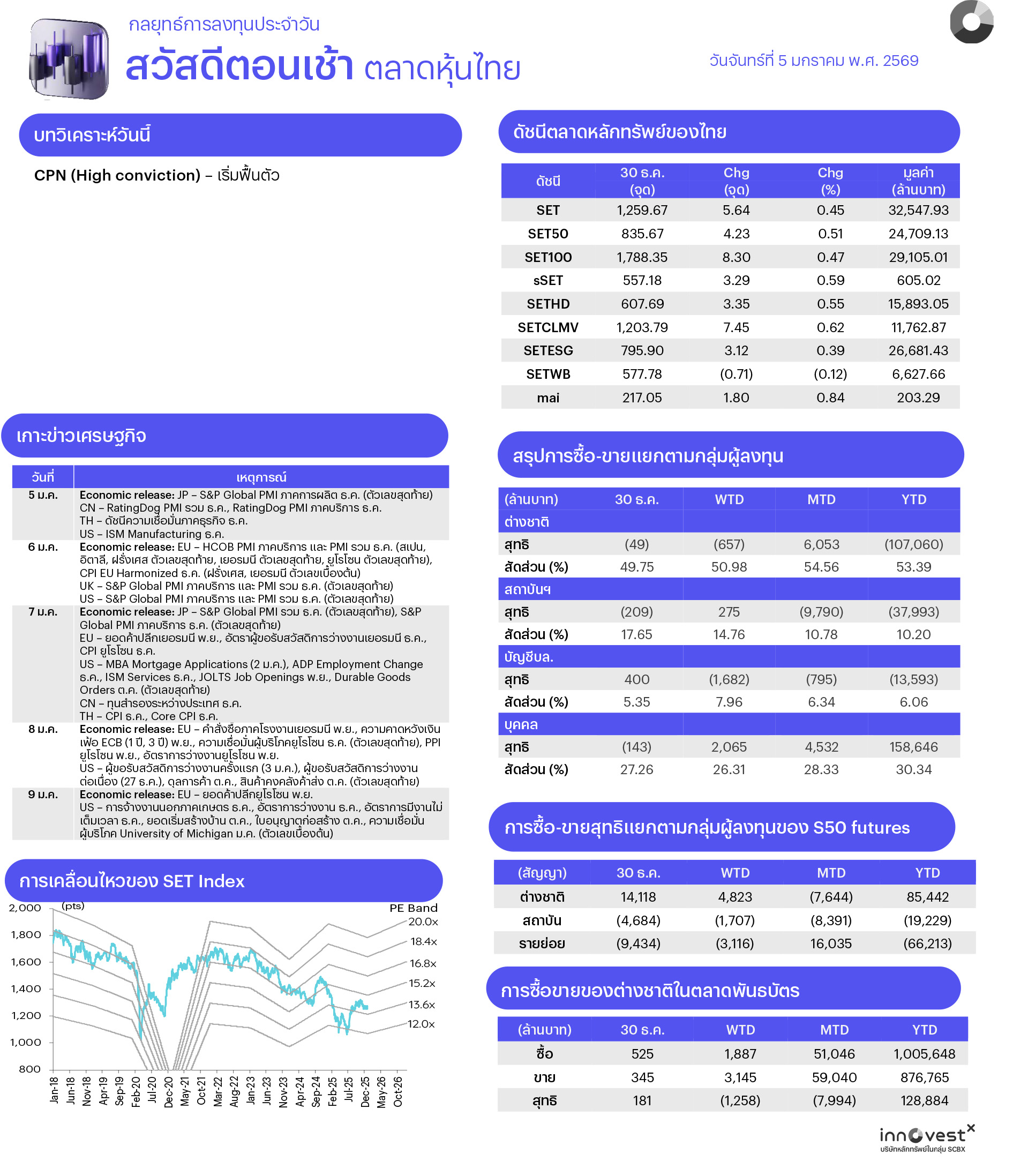 ช่วงสั้นมอง SET จะผันผวนในกรอบ 1250–1320 จุด โดยคาดบรรยากาศลงทุนมีแรงหนุนจาก January Effect ซึ่งจากสถิติย้อนหลัง 5 ปี (2564–2568) ช่วงสัปดาห์แรกของวันทำการหลังปีใหม่ SET จะปรับขึ้นเฉลี่ยราว 1.3% ด้วย Win Rate 60% สะท้อนพฤติกรรมกลับเข้าลงทุนของนักลงทุนหลังพ้นวันหยุดยาว ขณะเดียวกันมองตลาดจะเริ่มให้น้ำหนักกับปัจจัยการเมืองในประเทศมากขึ้น โดยเฉพาะนโยบายเศรษฐกิจของพรรคการเมืองหลักซึ่งอาจส่งผลต่อความคาดหวังเชิงบวกต่ออุตสาหกรรมและหุ้นที่เกี่ยวข้อง ส่วนปัจจัยภายนอกที่ต้องติดตามซึ่งอาจมีผลต่อจิตวิทยาการลงทุนระยะสั้น ได้แก่ สถานการณ์ตึงเครียดระหว่างสหรัฐ-เวเนซุเอลา, ข้อมูลตลาดแรงงานและ PMI ภาคการผลิต ธ.ค. ของสหรัฐ ดังนั้นกลยุทธ์การลงทุนจึงแนะนำ “Selective Buy”