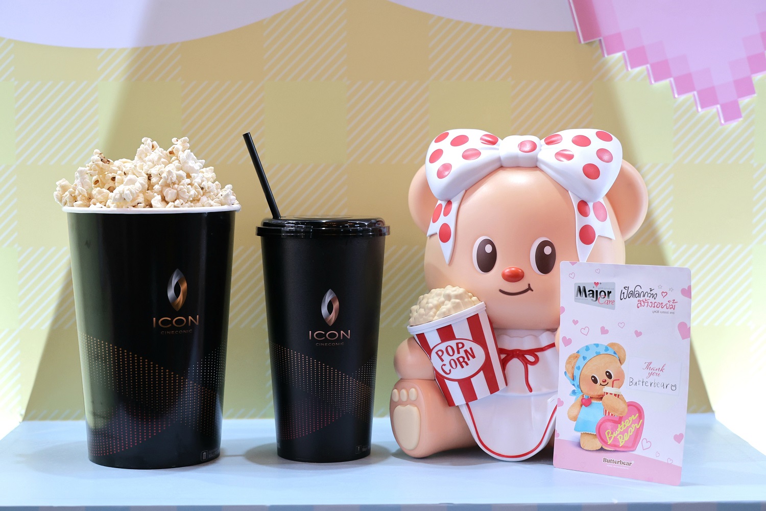จุดแดง พร้อมป๊อปคอร์นขนาด 64 ออนซ์ 1 ถุง, น้ำอัดลมขนาด 32 ออนซ์ 1 แก้ว และโปสการ์ดลาย Butterbear จำหน่ายในราคาชุดละ 1,000 บาท เพื่อร่วมส่งต่อแรงบันดาลใจและความสุขผ่านคาแรคเตอร์ “น้องหมีเนย” ที่ครองใจผู้คนทั่วโลก