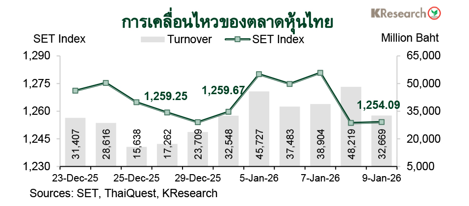 · ในวันศุกร์ที่ 9 ม.ค. 2569 ดัชนี SET ปิดที่ระดับ 1,254.09 จุด ลดลง 0.44% จากระดับปลายสัปดาห์ก่อน ขณะที่มูลค่าการซื้อขายเฉลี่ยต่อวันอยู่ที่ 40,600.37 ล้านบาท เพิ่มขึ้น 44.34% จากสัปดาห์ก่อน ส่วนดัชนี mai ลดลง 1.00% มาปิดที่ระดับ 214.89 จุด