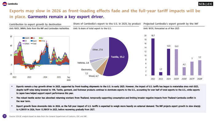 เศรษฐกิจกัมพูชามีแนวโน้มชะลอลง ตามการส่งออกสินค้าโดยเฉพาะในตลาดสหรัฐฯ อีกทั้งยังเผชิญแรงกดดันจากการแข่งขันที่รุนแรงขึ้นจากสินค้าจีนนำเข้า ความตึงเครียดบริเวณชายแดนที่ลดทอนความเชื่อมั่นของนักลงทุน จำนวนนักท่องเที่ยวที่ลดลงจากความกังวลด้านความปลอดภัย และเงินโอนกลับประเทศที่ลดลงจากแรงงานกัมพูชาที่เดินทางกลับจากไทย แม้เสถียรภาพด้านการคลังยังอยู่ในเกณฑ์ดี แต่รายได้ภาครัฐที่จำกัดและหนี้ต่างประเทศที่อยู่ในระดับสูงอาจจำกัดขีดความสามารถในการดำเนินนโยบายการคลังเพื่อพยุงเศรษฐกิจ