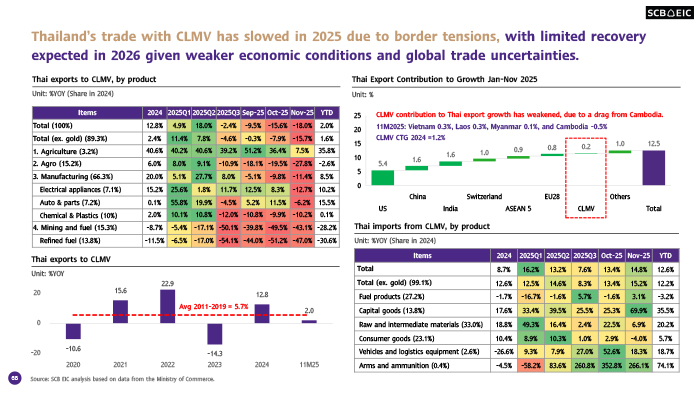 การค้าระหว่างไทยกับกลุ่มประเทศ CLMV เริ่มชะลอตัวตั้งแต่ไตรมาส 3/2568 ตามการค้ากับกัมพูชาที่หดตัวสูง และมีแนวโน้มชะลอลงต่อเนื่องถึงปี 2569 จากการเติบโตของเศรษฐกิจไทยและกลุ่มประเทศ CLMV ที่ชะลอลง ท่ามกลางอุปสงค์จากต่างประเทศที่อ่อนแอและความไม่แน่นอนของเศรษฐกิจโลกที่เพิ่มขึ้น ส่งผลให้แรงขับเคลื่อนด้านการค้าและการลงทุนปรับลดลง ขณะเดียวกัน ความเปราะบางเชิงโครงสร้าง อาทิ ความไม่แน่นอนทางการเมือง ภาระหนี้ต่างประเทศที่อยู่ในระดับสูง และความเสี่ยงด้านเสถียรภาพระบบการเงิน ยังคงกดดันการไหลเข้าของเงินลงทุนในภูมิภาค