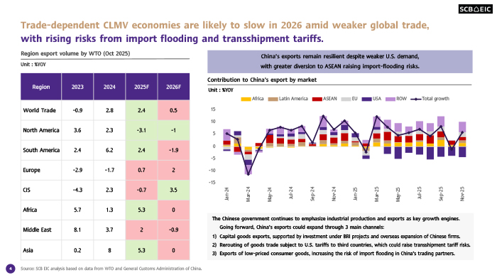 SCB EIC ประเมินว่าเศรษฐกิจกลุ่มประเทศ CLMV จะเติบโตชะลอลงที่ 5.6% ในปี 2569 จาก 6.4% ในปี 2568 จากการปรับขึ้นภาษีนำเข้าของสหรัฐฯ และการชะลอตัวของเศรษฐกิจโลก ขณะที่ยังมีความเสี่ยงจากภาษี Transshipment และภาษีเฉพาะรายสินค้าที่อยู่ระหว่างการพิจารณา อุปสงค์จากต่างประเทศที่ชะลอลงจะกดดันภาคการส่งออกและท่องเที่ยวของเศรษฐกิจกลุ่ม CLMV ทั้งนี้ แม้สหรัฐฯ และจีนจะสามารถบรรลุข้อตกลงการค้าชั่วคราวได้ซึ่งทำให้ความรุนแรงของสงครามการค้าปรับลดลง แต่โครงสร้างเศรษฐกิจจีนที่พึ่งพาภาคการผลิตและการส่งออกเป็นหลักจะเพิ่มความเสี่ยงการไหลเข้าของสินค้าจากจีน ขณะที่บางประเทศในกลุ่ม CLMV อาจเผชิญแรงกดดันเพิ่มเติมจากสินค้านำเข้าจากสหรัฐฯ ที่เพิ่มขึ้นภายหลังการทำข้อตกลงทางการค้ากับสหรัฐฯ