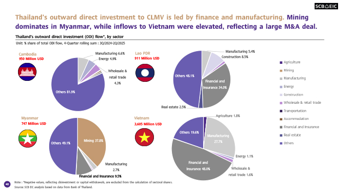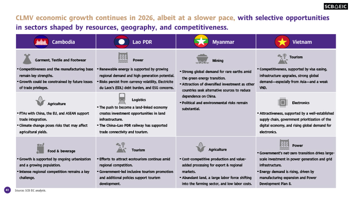 แม้จะเผชิญแรงกดดันหลายด้าน เศรษฐกิจของประเทศกลุ่ม CLMV จะยังมีอัตราการเติบโตเป็นบวกได้ในปี 2569 โดยภาคธุรกิจไทยยังมีโอกาสลงทุนในบางอุตสาหกรรมที่อาศัยความได้เปรียบด้านทรัพยากรธรรมชาติ ที่ตั้งทางภูมิศาสตร์ และความสามารถในการแข่งขันด้านต้นทุน ซึ่งเป็นส่วนหนึ่งของกลยุทธ์ในการดำเนินธุรกิจระยะยาว