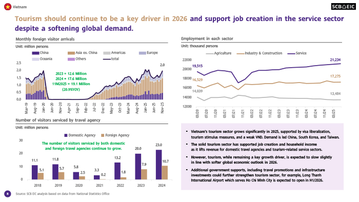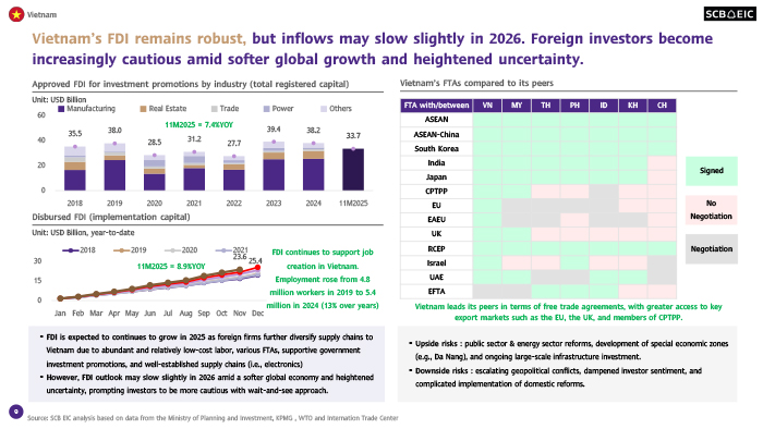 เศรษฐกิจเวียดนามมีแนวโน้มชะลอลงในปี 2569 แต่ยังเติบโตสูง ตามภาวะเศรษฐกิจโลกที่ชะลอลง โดยภาคการส่งออกจะได้รับผลกระทบจากมาตรการภาษีนำเข้าของสหรัฐฯ ชัดเจนขึ้นในปีนี้ และยังเผชิญกับความเสี่ยงจากภายนอกที่เพิ่มขึ้น อย่างไรก็ดี เศรษฐกิจเวียดนามจะขยายตัวได้แข็งแกร่ง จากแรงหนุนของเงินลงทุนโดยตรงจากต่างประเทศ (FDI) ที่จะไหลเข้าต่อเนื่อง ตามมาตรการสนับสนุนจากภาครัฐ รวมทั้งการปฏิรูปเชิงโครงสร้างที่จะส่งผลให้เศรษฐกิจเวียดนามเติบโตได้สูงขึ้น นอกจากนี้ ภาคการท่องเที่ยวจะยังมีบทบาทสำคัญในการขับเคลื่อนเศรษฐกิจและการจ้างงานในระยะข้างหน้า ขณะที่นโยบายการคลังและการเงินที่ผ่อนคลายจะช่วยรองรับแรงกดดันจากปัจจัยภายนอกได้บ้าง อย่างไรก็ตาม เวียดนามเผชิญปัจจัยเสี่ยงด้านต่ำสูง โดยเฉพาะภาคส่งออก จากเศรษฐกิจและนโยบายโลกที่ผันผวนและไม่แน่นอน