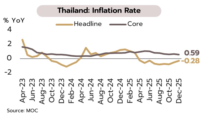วิจัยกรุงศรีคาดเงินเฟ้อปี 2569 ยังอยู่ในระดับต่ำที่ 0.4% จากปี 2568 ที่ติดลบเป็นครั้งแรกในรอบ 5 ปี โดยดือนธันวาคม 2568 อัตราเงินเฟ้อทั่วไปอยู่ที่ -0.28% YoY ติดลบเป็นเดือนที่ 9 ด้านอัตราเงินเฟ้อพื้นฐาน (หักอาหารสดและพลังงาน) ชะลอลงสู่ 0.59% ทั้งปี 2568 เงินเฟ้อทั่วไปและเงินเฟ้อพื้นฐานเฉลี่ยอยู่ที่ -0.14% และ 0.84% ตามลำดับ สำหรับปี 2569 คาดอัตราเงินเฟ้อทั่วไปจะกลับมาเป็นบวกในไตรมาส 2 แต่ยังอยู่ต่ำกว่ากรอบเป้าหมายของทางการที่ 1-3% โดยเฉลี่ยทั้งปีจะอยู่ที่ 0.4% ท่ามกลางราคาน้ำมันโลกที่เฉลี่ยใกล้เคียงกับปีก่อน มาตรการบรรเทาค่าครองชีพด้านพลังงาน และอุปสงค์ภายในประเทศที่ยังอ่อนแอ