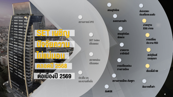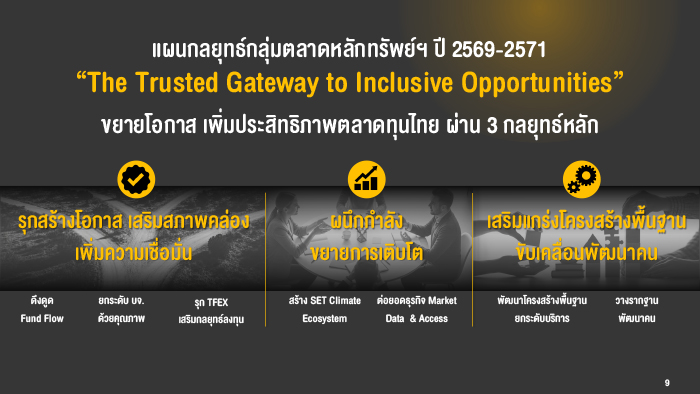 • ชู 3 กลยุทธ์หลัก จับมือทุกภาคส่วน ขับเคลื่อนตลาดทุนไทย ปลดล็อกอุปสรรค ผลักดันให้เกิดการเติบโตภายใต้ภาวะตลาดชะลอตัวและปัจจัยความผันผวนรอบด้าน
