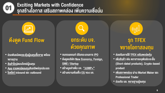 • ยกระดับบริษัทจดทะเบียนด้วยคุณภาพ: ผนึกหน่วยงานกำกับฯ ทบทวนกฎเกณฑ์และกระบวนการ IPO ให้รวดเร็วขึ้น เพื่อยกระดับคุณภาพและดึงดูดธุรกิจที่มีศักยภาพเข้าจดทะเบียนในตลาดหลักทรัพย์ไทย และผลักดันให้สามารถแข่งขันกับตลาดหุ้นต่างประเทศได้ พร้อมร่วมมือกับสำนักงานคณะกรรมการส่งเสริมการลงทุน (BOI) และโครงการพัฒนาระเบียงเศรษฐกิจพิเศษภาคตะวันออก (EEC) ดึงดูดบริษัทกลุ่ม New Economy, บริษัทต่างชาติ รวมถึง SME และ Startup เข้าสู่ตลาดทุนไทย ขณะเดียวกัน มุ่งสร้างมูลค่าเพิ่ม บจ. ปัจจุบัน เดินหน้าสร้าง visibility แผนงานของ บจ. ในโครงการ JUMP+ ต่อเนื่อง ควบคู่ไปกับการเสริมสร้างความเข้มแข็งด้านบรรษัทภิบาลของ บจ. ไทย