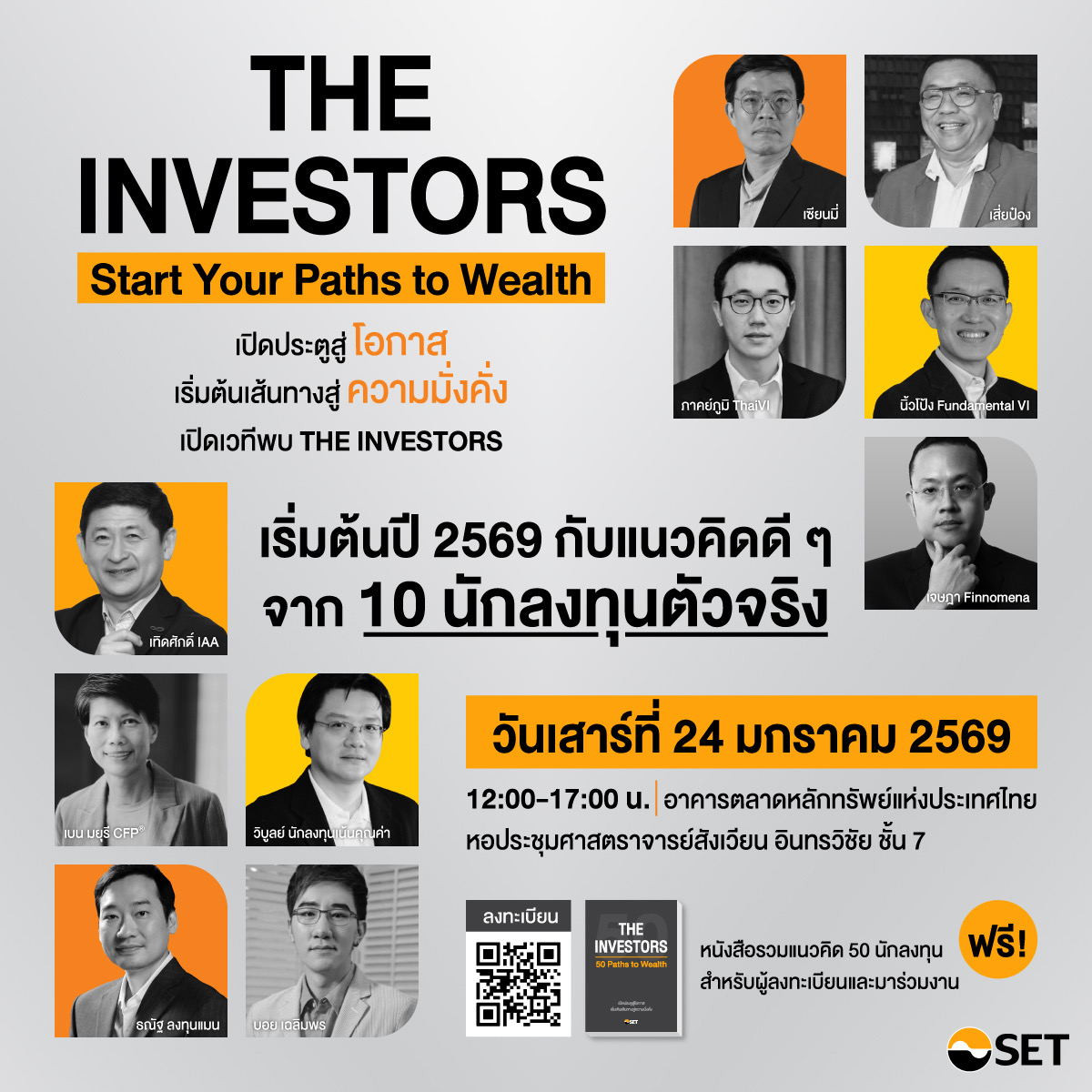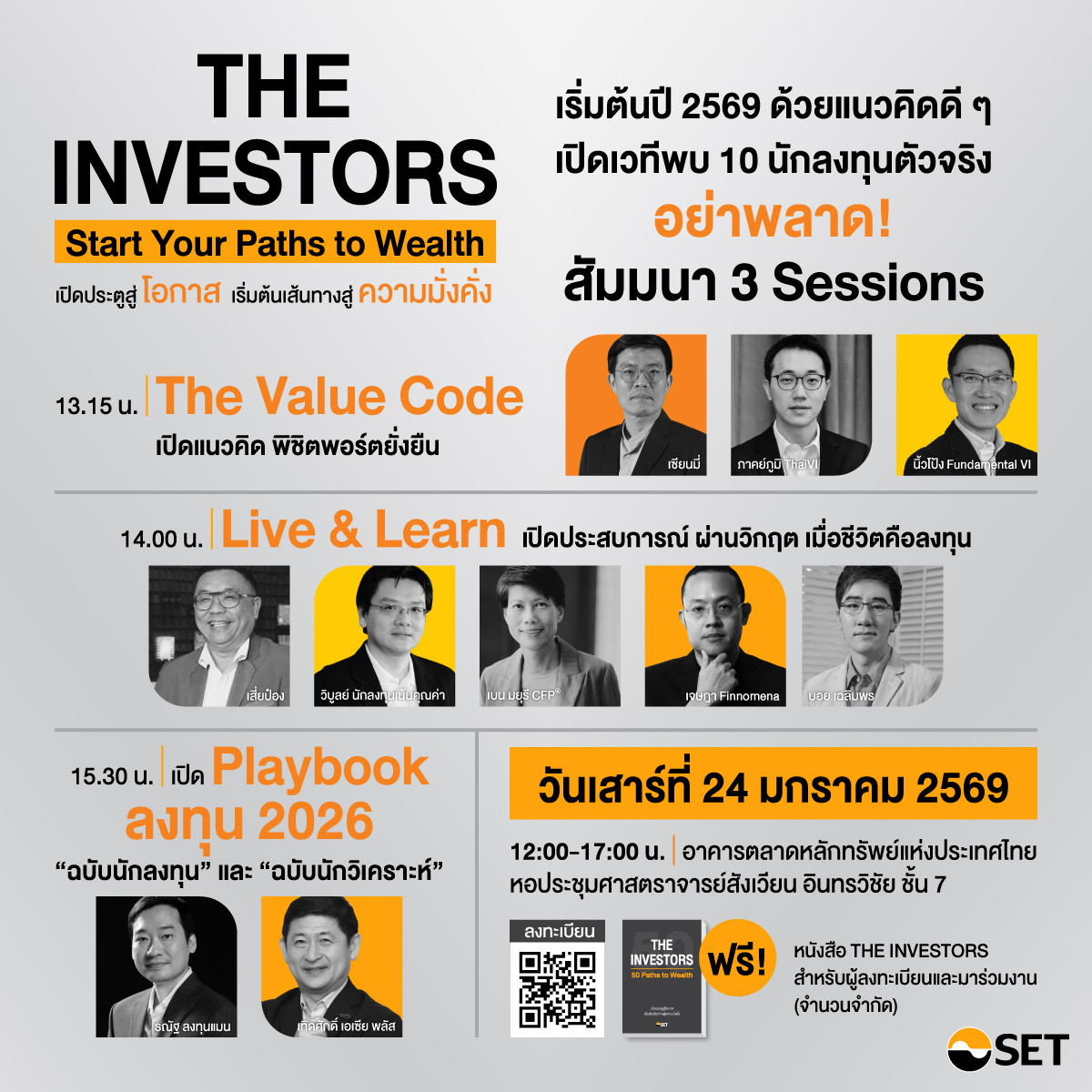 พบกันวันเสาร์ที่ 24 มกราคม 2569 เวลา 12.00–17.00 น. ณ ตลาดหลักทรัพย์แห่งประเทศไทย พร้อมร่วมกิจกรรมมากมายในงาน พิเศษ ! ผู้ที่ลงทะเบียนล่วงหน้าและมาร่วมงาน รับฟรีที่แรก หนังสือ “THE INVESTORS” พร้อมใกล้ชิดนักเขียน ลงทะเบียนร่วมงานได้ที่ https://www.set.or.th/th/about/event-calendar/event/eventdetails?id=88086