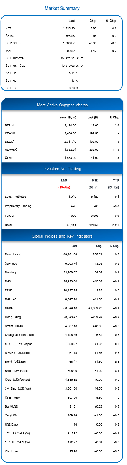 อ่อนตัวเล็กน้อย – หุ้นสหรัฐฯ ปรับตัวลงแม้ JPMorgan รายงานกำไร Q4 ดีกว่าคาด ตลาดกังวลกรณีทรัมป์เสนอให้มีการกำหนดเพดานดบ.บัตรเครดิตที่ระดับ 10% เป็นเวลา 1 ปี ขณะที่เงินเฟ้อสหรัฐฯ ใน ธ.ค. สอดคล้องกับที่ตลาดคาด ทำให้ FED น่าจะยังคงดบ.ในการประชุมปลายเดือนนี้ ด้านราคาน้ำมันดิบ WTI พุ่งไม่หยุด +2.8% ทะลุ 61 $/bbl คาดประท้วงอิหร่านยืดเยื้อกระทบอุปทาน และทรัมป์กดดันเล็งเก็บภาษี 25% กับปท.ที่ทำธุรกิจกับอิหร่าน