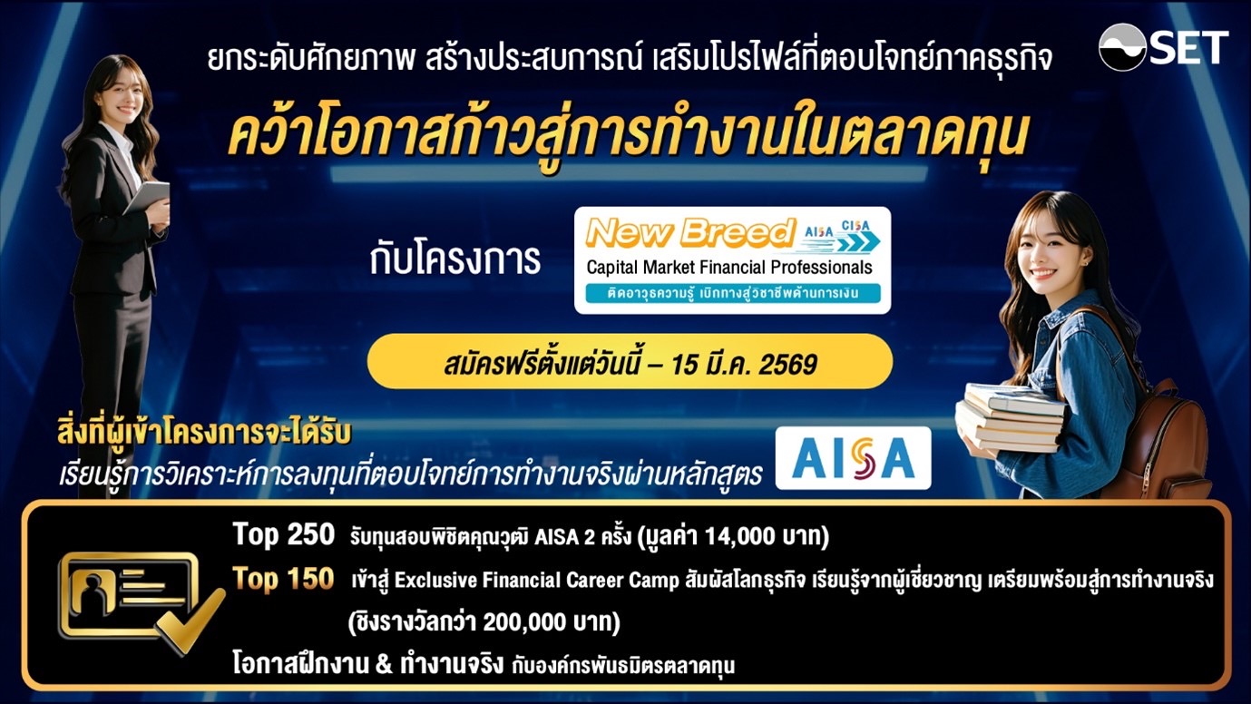 ตลาดหลักทรัพย์แห่งประเทศไทย ชวนนิสิต นักศึกษา และผู้ที่สนใจเริ่มต้นเส้นทางวิชาชีพด้านการเงิน กับ "โครงการทุน New Breed Capital Market Financial Professionals 2026" เพื่ออัปสกิลความรู้ และพัฒนาทักษะสู่การเป็นบุคลากรคุณภาพในตลาดทุน ผู้เข้าร่วมโครงการจะได้เรียนรู้การวิเคราะห์ทางการเงินและการจัดการลงทุนผ่านหลักสูตร AISA และรับ e-Book ครบชุด ฟรี พร้อมโอกาสคว้าทุนสอบคุณวุฒิ AISA 2 ครั้ง มูลค่า 14,000 บาท จำนวน 250 ทุน นอกจากนี้ยังมีสิทธิ์เข้าร่วมกิจกรรม Exclusive Financial Career Camp สัมผัสโลกธุรกิจและการทำงานของมืออาชีพผ่านการเยี่ยมชมกิจการ พร้อมร่วมแข่งขันวิเคราะห์เคสด้านการเงินการลงทุน ชิงทุนสอบ CISA และเงินรางวัลรวม 200,000 บาท ผู้สนใจสามารถสมัครเข้าร่วมโครงการได้ตั้งแต่วันนี้ – 15 มีนาคม 2569 ไม่มีค่าใช้จ่าย ดูรายละเอียดเพิ่มเติมได้ที่ www.set.or.th/newbreed2026