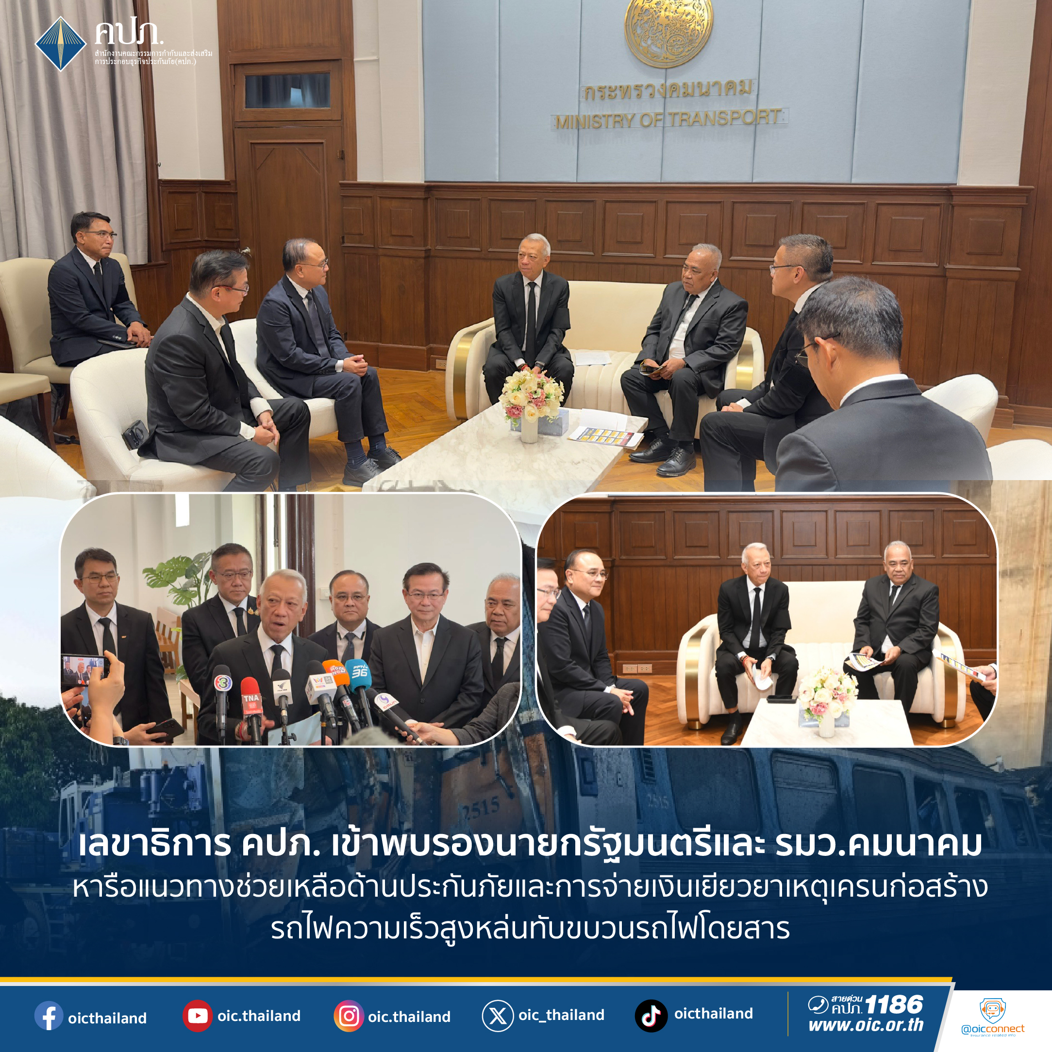 เลขาธิการ คปภ. กล่าวเพิ่มเติมว่า เหตุการณ์ดังกล่าวถือเป็นความสูญเสียครั้งใหญ่ที่ไม่มีใครอยากให้เกิดขึ้น สำนักงาน คปภ. พร้อมประสานงานร่วมกับหน่วยงานที่เกี่ยวข้อง เพื่อสนับสนุนการดูแลสิทธิประโยชน์ด้านประกันภัยของผู้ประสบเหตุอย่างต่อเนื่อง และร่วมผลักดันแนวทางการยกระดับมาตรฐานการคุ้มครองผู้โดยสารในระบบขนส่งสาธารณะโดยเฉพาะการศึกษาแนวทางบรรจุประกันภัยการเดินทางโดยรถไฟ เพื่อให้ผู้โดยสารรับทราบสิทธิการเยียวยาที่ชัดเจนทันทีหากเกิดเหตุในอนาคต และยกระดับมาตรฐานความปลอดภัยระบบขนส่งสาธารณะของประเทศ ทั้งนี้ หากประชาชนมีข้อสงสัยหรือต้องการความช่วยเหลือด้านการประกันภัย สามารถติดต่อสายด่วน คปภ. 1186 หรือ LINE Official Account @OICConnect “คปภ. รอบรู้” ตลอด 24 ชั่วโมง