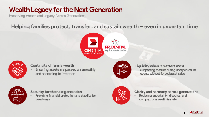 ประกันชีวิต (Bancassurance) - ประกันชีวิตเป็นส่วนสำคัญของการวางแผนความมั่งคั่งในระยะยาว โดยเฉพาะเมื่อประเทศไทยกำลังก้าวเข้าสู่สังคมผู้สูงอายุ (Aging Society) ธนาคารจึงมุ่งมั่นพัฒนาผลิตภัณฑ์และบริการที่ตอบโจทย์ทั้งการออม การคุ้มครอง และการส่งต่อมรดก เพื่อให้ลูกค้าทุกกลุ่มสามารถวางแผนชีวิตและอนาคตได้อย่างมั่นคง