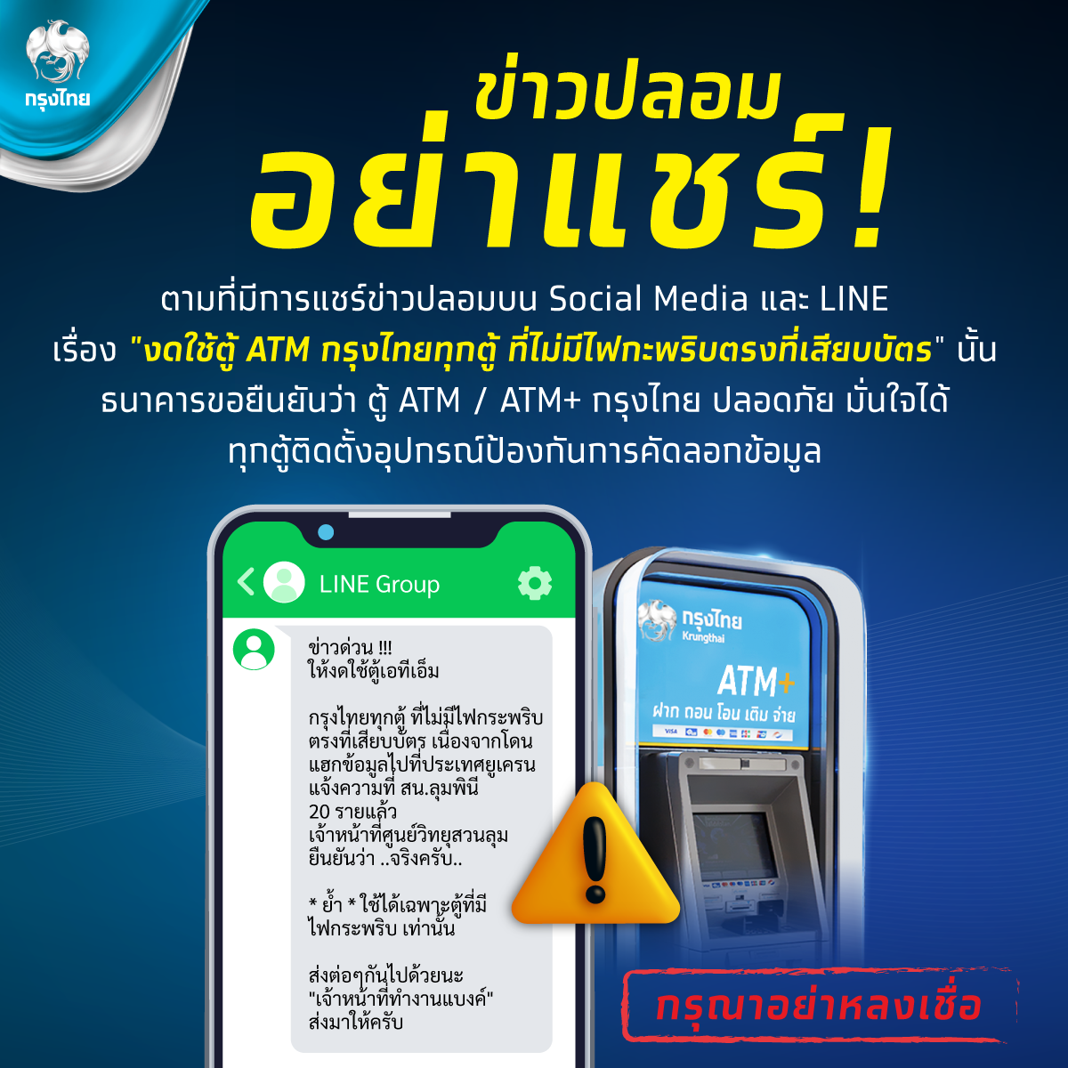 ตามที่มีการแชร์ข่าวปลอมใน Social Media เรื่องขอให้ "งดใช้ตู้ ATM กรุงไทยทุกตู้ ที่ไม่มีไฟกะพริบตรงที่เสียบบัตร" นั้น ธนาคารขอยืนยันว่า ตู้ ATM / ATM+ กรุงไทย ปลอดภัย มั่นใจได้ ทุกตู้ติดตั้งอุปกรณ์ป้องกันการคัดลอกข้อมูล