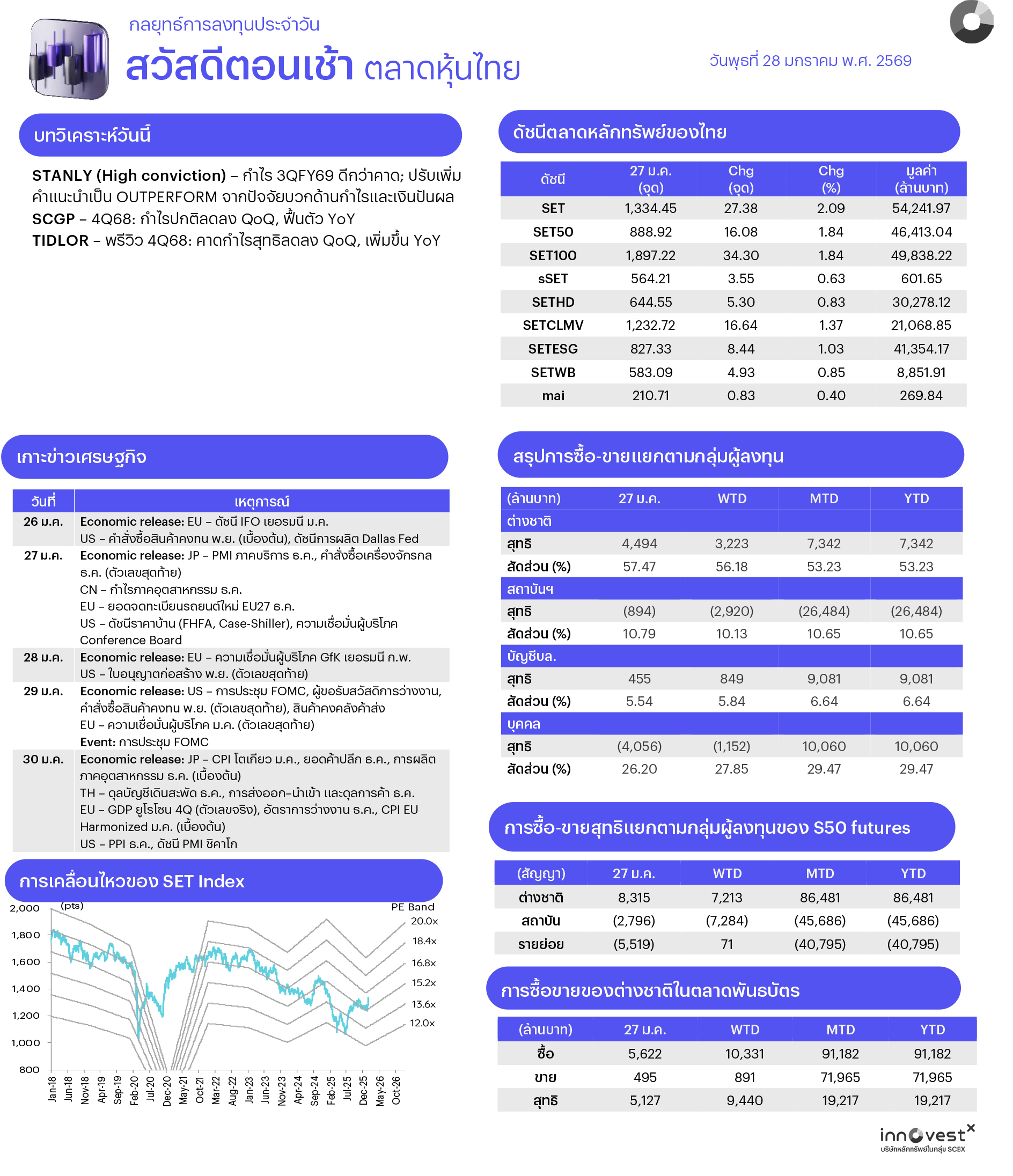 ช่วงสั้นมอง SET แกว่งตัวในกรอบ 1,270–1,360 จุด ปัจจัยในประเทศติดตามการไหลเข้าของ Fund Flow หลังกลับมาซื้อสุทธิในสัปดาห์ก่อน, การทยอยประกาศผลประกอบการ 4Q68 ของหุ้น Real Sector, นโยบายหาเสียงด้านเศรษฐกิจของพรรคการเมืองซึ่งจะมีผลต่ออุตสาหกรรมและหุ้นที่เกี่ยวข้อง ส่วนปัจจัยภายนอกติดตาม ผลการประชุมนโยบายการเงินของเฟดในวันที่ 28-29 ม.ค. แม้ตลาดคาดเฟดจะคงดอกเบี้ยแต่จับตาการส่งสัญญาณทิศทางดอกเบี้ยในระยะถัดไป, ความไม่แน่นอนเชิงนโยบายของ ปธน. ทรัมป์ ที่มีต่อต่างประเทศ (ตะวันออกกลาง, ยุโรปและจีน) ซึ่งมีผลต่อบรรยากาศการลงทุนในสินทรัพย์เสี่ยง ดังนั้นกลยุทธ์การลงทุนจึงแนะนำ “Selective Buy”