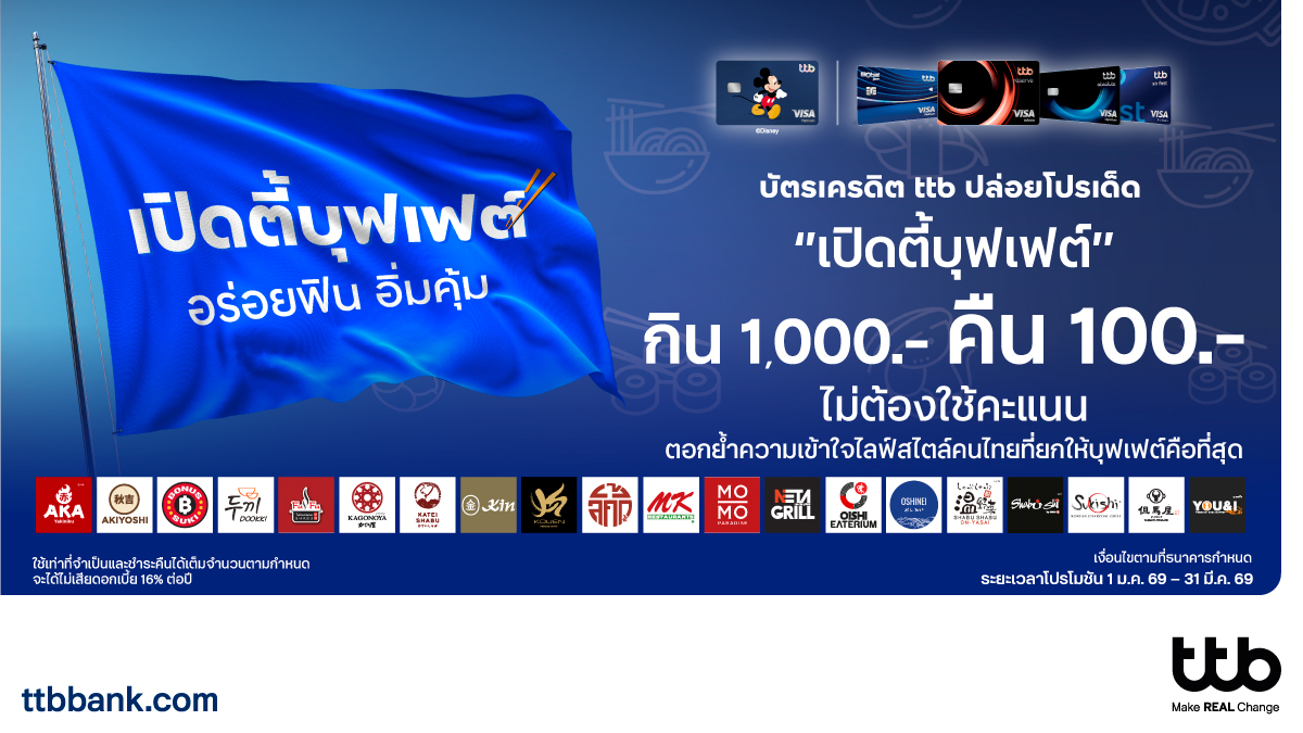 โดยมีร้านบุฟเฟต์ชื่อดังมากกว่า 50 ร้านทั่วประเทศ ครอบคลุมกลุ่มปิ้งย่าง ชาบู ซูชิ และบุฟเฟต์นานาชาติ เพื่อรองรับความหลากหลายของไลฟ์สไตล์ลูกค้าในทุกกลุ่ม อาทิ AKA, Akiyoshi, Kagonoya, MK Restaurants, Mo-Mo-Paradise / Mo-Mo-Paradise Gold, Nene Grill, Oishi Eaterium / Oishi Grand, Shabushi, You&I Premium Suki Buffet ที่พร้อมมอบความคุ้มค่าให้ลูกค้าบัตรเครดิต ttb รับเครดิตเงินคืนทันที 100 บาท เมื่อใช้จ่ายครบ 1,000 บาท / เซลล์สลิป แบบไม่ต้องแลกคะแนน และรับเงินคืนสูงสุด 400 บาท / ท่านตลอดรายการ ตั้งแต่วันที่ 1 มกราคม 2569 – 31 มีนาคม 2569 ลูกค้าสามารถลงทะเบียนเพียงครั้งเดียวผ่านแอป ttb touch เพื่อรับสิทธิ์ตลอดระยะเวลาแคมเปญ ศึกษารายละเอียดเพิ่มเติมของแคมเปญและรายชื่อร้านอาหารที่ร่วมรายการ ได้ที่ https://www.ttbbank.com/link/fbweb-buffet-jan26