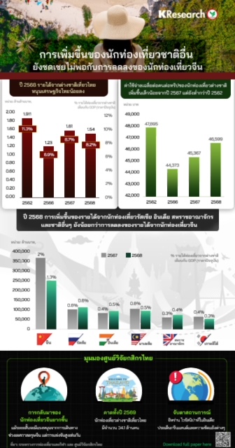 • โดยในปี 2568 นักท่องเที่ยวจีนมีรายได้ท่องเที่ยวอันดับ 1 หรือคิดเป็นมูลค่าประมาณ 2.5 แสนล้านบาท แม้การเพิ่มขึ้นของรายได้จากนักท่องเที่ยวรัสเซีย อินเดีย สหราชอาณาจักร และชาติอื่นๆ แต่ยังน้อยกว่าการลดลงของรายได้จากนักท่องเที่ยวจีน