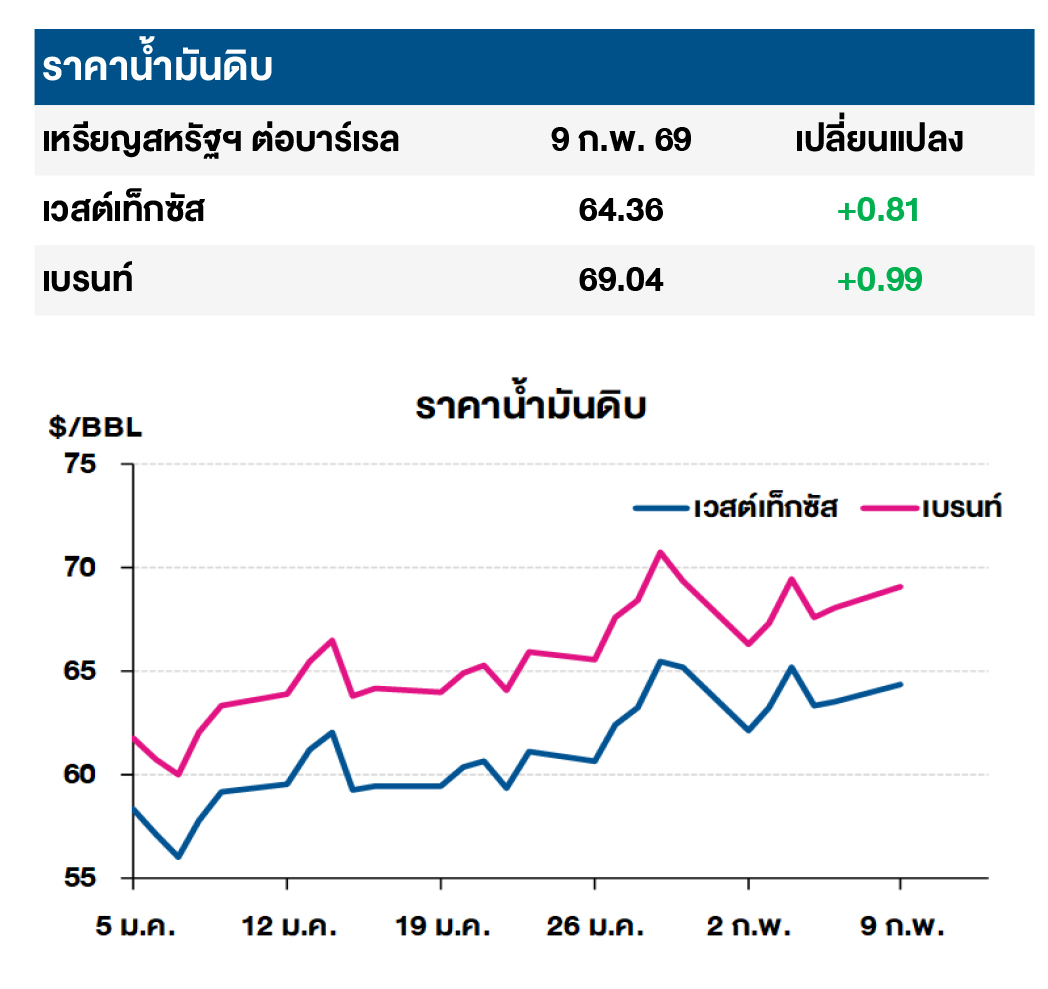 (+) ราคาน้ำมันดิบเวสต์เท็กซัสและเบรนท์ปรับเพิ่มขึ้นกว่า 1% หลังกระทรวงคมนาคมสหรัฐฯ ออกคำแนะนำให้เรือที่ติดธงสหรัฐฯ อยู่ห่างจากน่านน้ำอิหร่านให้มากที่สุดเท่าที่จะเป็นไปได้ขณะแล่นผ่านช่องแคบฮอร์มุซและอ่าวโอมานเพื่อหลีกเลี่ยงความเสี่ยงที่ จะถูกกองกำลังอิหร่านขึ้นตรวจค้น โดยก่อนหน้านี้เมื่อวันที่ 3 ก.พ. 69 ได้เกิดเหตุที่เรืออิหร่านสั่งให้เรือบรรทุกน้ำมันสัญชาติสหรัฐฯ หยุดเดินเครื่องเพื่อเตรียมเข้าตรวจค้น ก่อนที่เรือดังกล่าวจะเร่งความเร็วและแล่นต่อไปได้ ซึ่งการเคลื่อนไหวดังกล่าวเพิ่มความกังวลว่าความตึงเครียดระหว่างสหรัฐฯ และอิหร่านอาจนำไปสู่การหยุดชะงักของอุปทานน้ำมัน