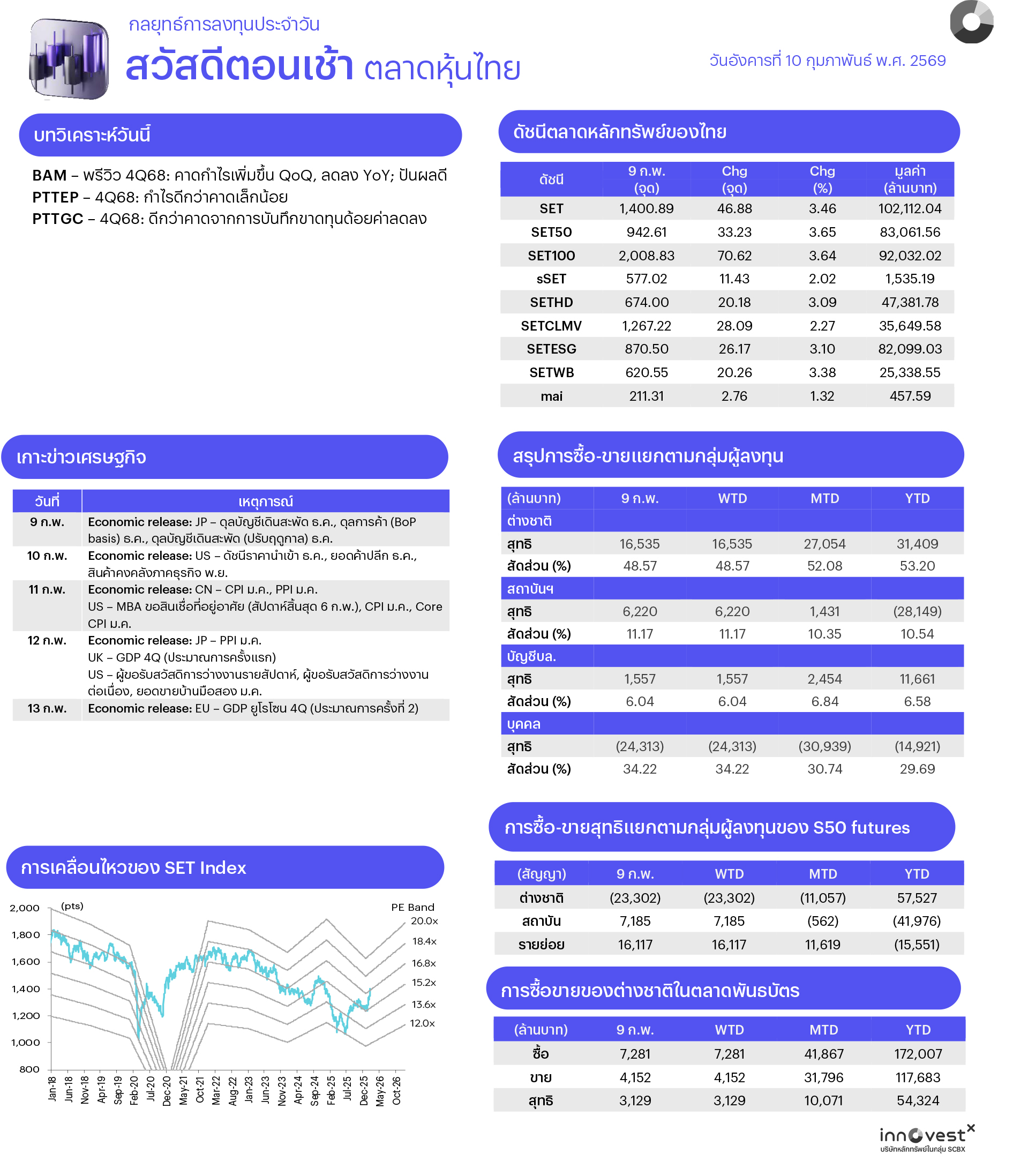 11. ตลาดหุ้นไทยปิด (10 ก.พ. 69) บวก 9.55 จุด ดัชนี 1,410.44 จุด