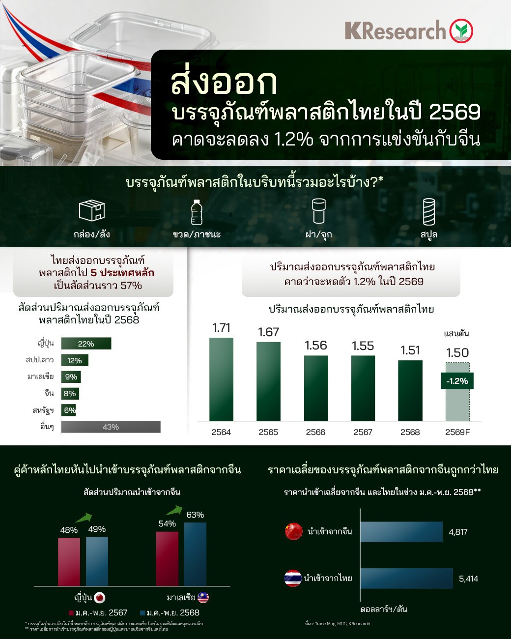 ศูนย์วิจัยกสิกรไทยวิเคราะห์ "ส่งออกบรรจุภัณฑ์พลาสติกไทยในปี 2569 คาดจะลดลง 1.2% จากการแข่งขันกับจีน"