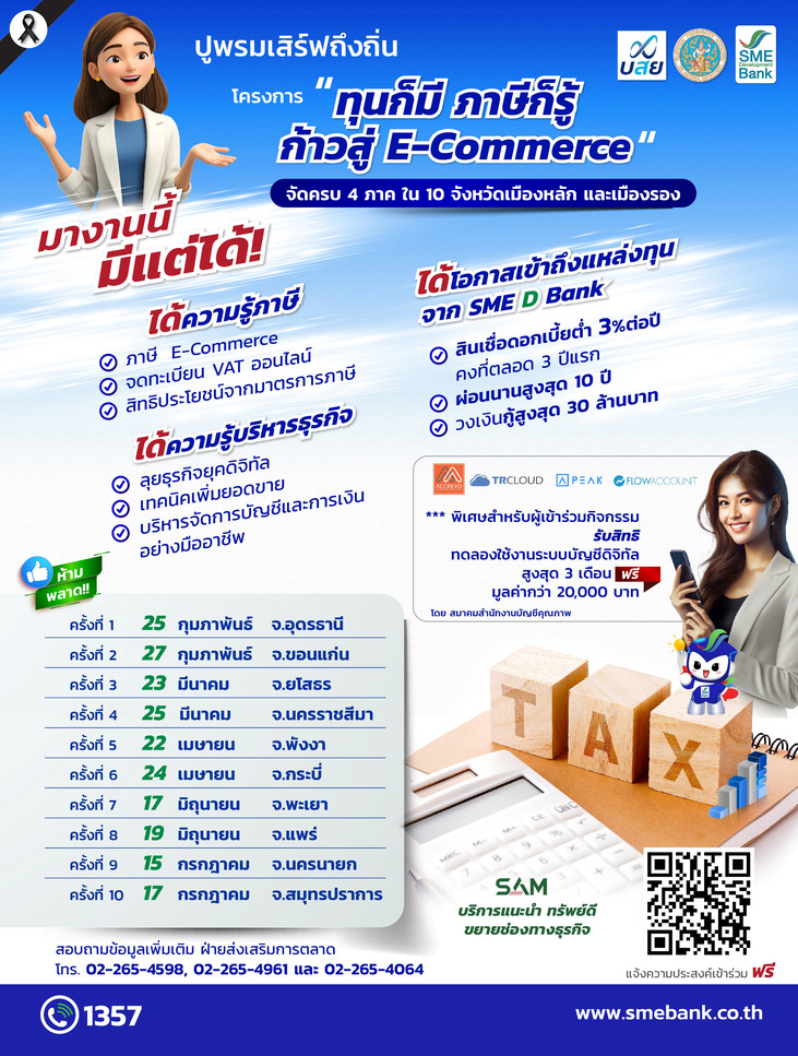 SME D Bank เดินหน้าภารกิจธนาคารเพื่อการพัฒนา ผนึกกำลัง กรมสรรพากร และ บสย. ลุยโครงการ "ทุนก็มี ภาษีก็รู้ ก้าวสู่ E-Commerce" ปูพรมเสริมแกร่งเอสเอ็มอีให้ก้าวทันการดำเนินธุรกิจในยุคดิจิทัล ผ่านการจัดงานในรูปแบบ ONE Stop Service เติมเต็มความรู้การเงิน ใช้ประโยชน์จากภาษี  เพิ่มทักษะขยายตลาดอีคอมเมิร์ซ และผลักดันเข้าถึงแหล่งทุนดอกเบี้ยพิเศษ ไม่ต้องใช้หลักทรัพย์ค้ำประกัน  กำหนดจัด 10 ครั้ง ใน 10 จังหวัดทั่วประเทศ  ระหว่างเดือน ก.พ.-ก.ค. 2569 นี้  เปิดกว้างเข้าร่วมฟรี ไม่มีค่าใช้จ่ายใดๆ ทั้งสิ้น