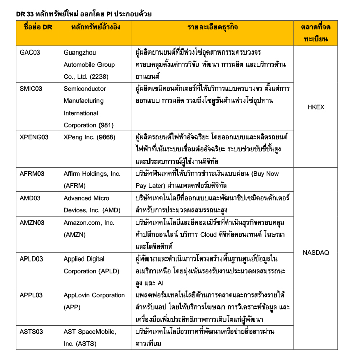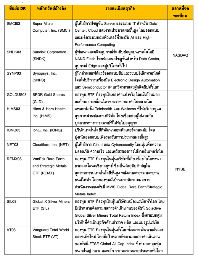 ตลาดหลักทรัพย์แห่งประเทศไทย รับจดทะเบียนตราสารแสดงสิทธิในหลักทรัพย์ต่างประเทศ (DR) 36 หลักทรัพย์ใหม่ อ้างอิงหลักทรัพย์ชั้นนำในตลาดหลักทรัพย์ฮ่องกง (HKEX) ตลาดหลักทรัพย์แนสแด็ก (NASDAQ) และตลาดหลักทรัพย์นิวยอร์ก (NYSE) ออกโดย บริษัทหลักทรัพย์ พาย จำกัด (มหาชน) (PI) และบริษัทหลักทรัพย์ หยวนต้า (ประเทศไทย) จำกัด (Yuanta) เริ่มซื้อขายในตลาดหลักทรัพย์ไทย 5 มีนาคม 2569