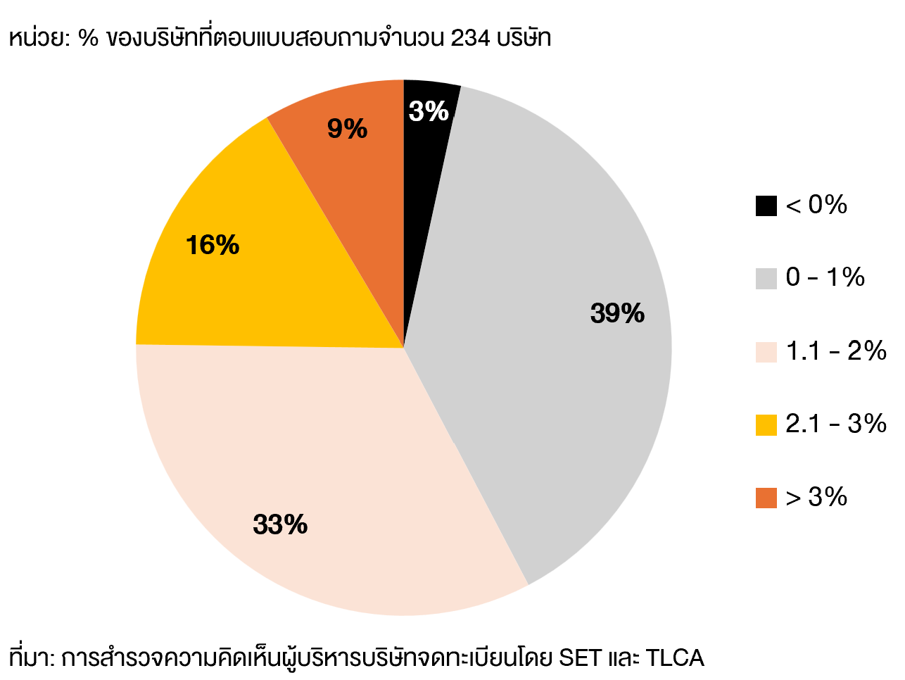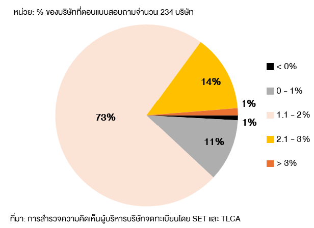 CEO ของบริษัทจดทะเบียนที่ร่วมตอบแบบสอบถามกว่า 3 ใน 4 คาดการณ์ว่า อัตราการเติบโตของเศรษฐกิจของไทยจะเติบโตได้ราว 1.1 – 2% ซึ่งอยู่ในกรอบใกล้เคียงกับการประมาณการตัวเลขทางเศรษฐกิจของสภาพัฒน์ และธนาคารแห่งประเทศไทยที่ประมาณ 2% รวมถึงการคาดการณ์ของธนาคารโลกที่ 1.6%1