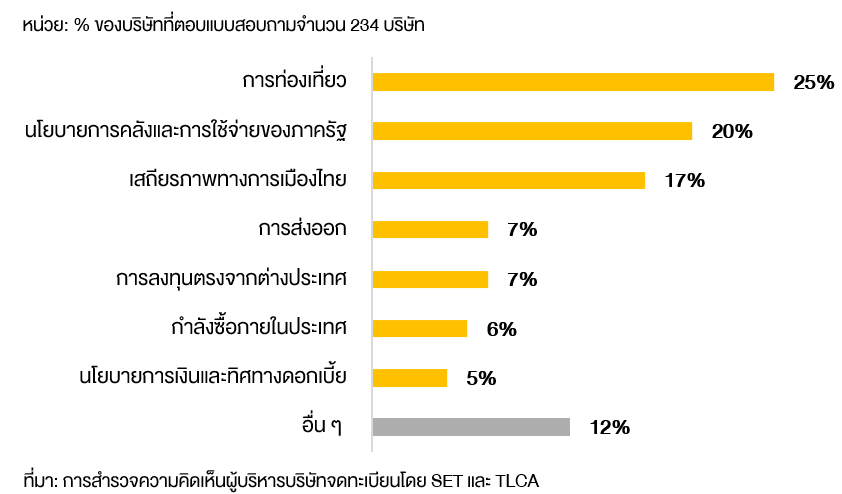 สำหรับปัจจัยสนับสนุนการเติบโตทางเศรษฐกิจในปีนี้ CEO ส่วนใหญ่มองว่าแรงขับเคลื่อนสำคัญ 3 อันดับแรก ได้แก่ ภาคการท่องเที่ยว (25%) นโยบายการคลังและการใช้จ่ายภาครัฐ (20%) และเสถียรภาพทางการเมืองในประเทศ (17%) ขณะเดียวกัน ผู้บริหารบางส่วนยังให้ความเห็นเพิ่มเติมว่า ความก้าวหน้าของเศรษฐกิจดิจิทัล และความคืบหน้าในการเจรจาข้อตกลงการค้าเสรี (FTA) รวมถึงการแก้ปัญหาการคอร์รัปชันจะเป็นปัจจัยเสริมที่ช่วยเพิ่มศักยภาพการเติบโตของเศรษฐกิจไทยในระยะยาว