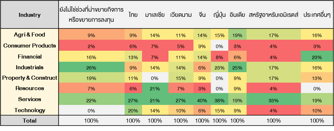 เมื่อจำแนกตามอุตสาหกรรม พบว่าประเทศเวียดนามเป็นจุดหมายหลักของหลายกลุ่มธุรกิจ โดยเฉพาะ ธุรกิจบริการ และกลุ่มสินค้าอุตสาหกรรม สะท้อนบทบาทของประเทศเวียดนามในฐานะฐานการผลิตและตลาดเติบโตในอาเซียน ขณะที่กลุ่ม Services มีลักษณะกระจายการลงทุนในหลายประเทศมากที่สุด แสดงถึงความคล่องตัวในการขยายธุรกิจ ต่างจากบางอุตสาหกรรมที่พบว่ายังไม่มีแผนจะขยายการลงทุนค่อนข้างสูง ซึ่งสะท้อนท่าทีที่ระมัดระวังต่อภาวะเศรษฐกิจและต้นทุนทางการเงิน