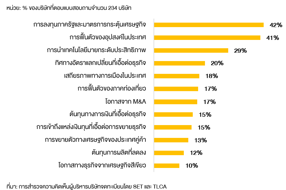 ในช่วง 12 เดือนข้างหน้า CEO ส่วนใหญ่มองว่าปัจจัยที่จะเอื้อต่อการดำเนินธุรกิจ 3 อันดับแรกได้แก่ การลงทุนของภาครัฐและมาตรการกระตุ้นเศรษฐกิจ การฟื้นตัวของอุปสงค์ในประเทศ และการนำเทคโนโลยีมายกระดับประสิทธิภาพขององค์กร ตามลำดับ ปัจจัยอื่น ๆ ที่คล้ายคลึงกับปัจจัยที่จะมาขับเคลื่อนเศรษฐกิจได้แก่ เสถียรภาพทางการเมืองในประเทศ และภาคการท่องเที่ยว ซึ่งสะท้อนผ่านผลการเลือกตั้งที่เกิดขึ้นเมื่อวันที่ 8 กุมภาพันธ์ 2569 และการฟื้นตัวของอุตสาหกรรมท่องเที่ยวในช่วงต้นปี นอกจากปัจจัยเบื้องต้นแล้ว จะเป็นปัจจัยสนับสนุนเฉพาะตัวของแต่ละอุตสาหกรรม