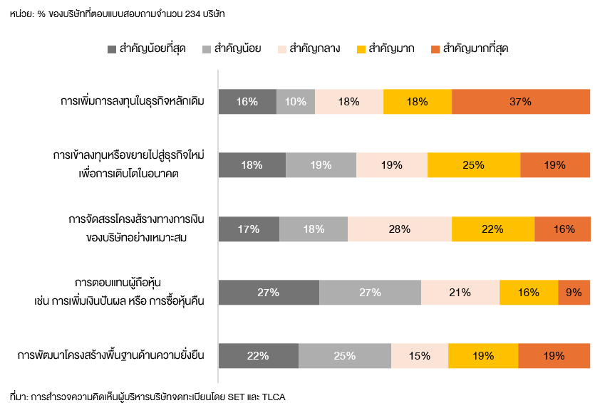 - ผลการสำรวจสะท้อนว่า ผู้บริหารบริษัทจดทะเบียน ให้ความสำคัญกับการสร้าง Shareholder Value ในรูปแบบของการเติบโตทางธุรกิจเป็นหลัก โดยมุ่งเน้นการเพิ่มการลงทุนในธุรกิจหลักเดิม (37%) ควบคู่ไปกับการแสวงหาโอกาสในธุรกิจใหม่