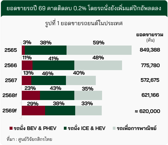 · ยอดขายรถยนต์ในประเทศปี 2569 คาดหดตัว 0.2% (YoY) สู่ระดับประมาณ 6.2 แสนคัน โดยได้รับแรงกดดันหลักจากยอดขายรถยนต์เพื่อการพาณิชย์ที่คาดลดลง 5% (YoY) แม้ยอดขายรถยนต์นั่งคาดขยายตัว 2% (YoY) ตามการเติบโตของยอดขายรถยนต์ BEV & PHEV ซึ่งคาดเพิ่มขึ้น 28% (YoY) สู่ราว 1.81 แสนคัน