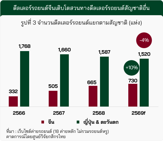 ในปี 2569 จำนวนดีลเลอร์รถยนต์จีนคาดเพิ่มขึ้นเป็นราว 730 แห่ง หรือเติบโต 10% (YoY) ตรงข้ามกับดีลเลอร์รถยนต์ญี่ปุ่นและตะวันตกที่คาดลดลงเหลือประมาณ 1,520 แห่ง หรือหดตัว 4% (YoY) (รูปที่ 3)