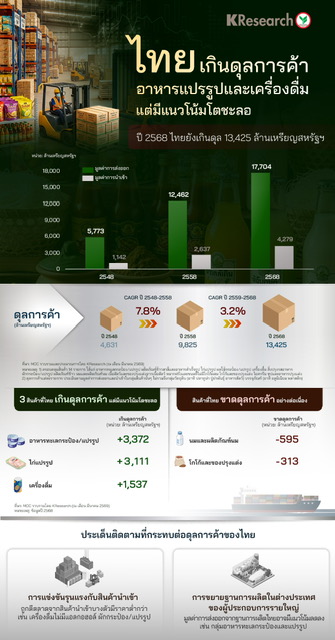 • ปี 2568 ไทยยังเกินดุลการค้าอาหารแปรรูปและเครื่องดื่ม 13,425 ล้านเหรียญสหรัฐฯ แต่มีแนวโน้มโตชะลอ