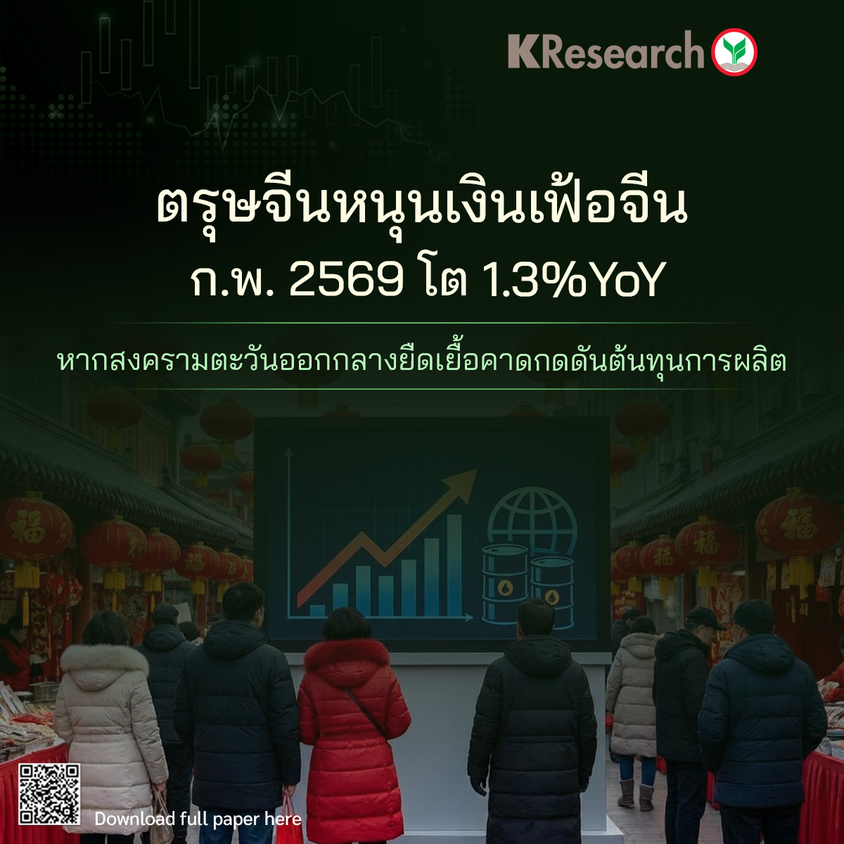 ศูนย์วิจัยกสิกรไทยมองว่าเงินเฟ้อจีนเร่งตัวขึ้นจากปัจจัยชั่วคราวอย่างเทศกาลตรุษจีน แต่ปัจจัยกดดันต่อการใช้จ่ายในประเทศยังมีอยู่ โดยเมื่อพิจารณาการท่องเที่ยวช่วงเทศกาลตรุษจีน แม้จำนวนนักท่องเที่ยว และรายได้จะเพิ่มขึ้น แต่การใช้จ่ายเพื่อการท่องเที่ยวต่อหัว (Tourist Expenditure per capita) ลดลงเล็กน้อยอยู่ที่ 1,348 หยวน จาก 1,351 หยวน สะท้อนว่าครัวเรือนยังมีแนวโน้มระมัดระวังการใช้จ่าย ขณะที่ในการประชุมสองสภาของจีนปี 2569 ได้ประกาศเป้าหมายการเติบโตของเศรษฐกิจจีนปี 2569 ชะลอลงอยู่ที่ 4.5-5.0% และเป้าหมายเงินเฟ้อคงเดิมอยู่ที่ 2.0% โดยงบประมาณขาดดุล (Board deficit) อยู่ที่ 4% คงเดิมจากปีก่อน รวมถึงวงเงินการออกพันธบัตรรัฐบาลท้องถิ่นไม่เปลี่ยนแปลง สะท้อนว่า ปี 2569 นี้จีนจะเน้นการเติบโตอย่างมีคุณภาพ โดยคาดว่าจะไม่มีมาตรการกระตุ้นการใช้จ่ายขนาดใหญ่ แต่เน้นเป็นมาตรการเฉพาะจุดเพื่อแก้ไขปัญหาเชิงโครงสร้าง เช่น การเพิ่มสวัสดิการผู้สูงอายุ หรือมาตรการที่สนับสนุนอัตราการเกิด เป็นต้น ซึ่งคาดว่าผลจากมาตรการจะส่งผ่านมาสู่เงินเฟ้อได้จำกัด และต้องใช้ระยะเวลากว่าจะเห็นผล